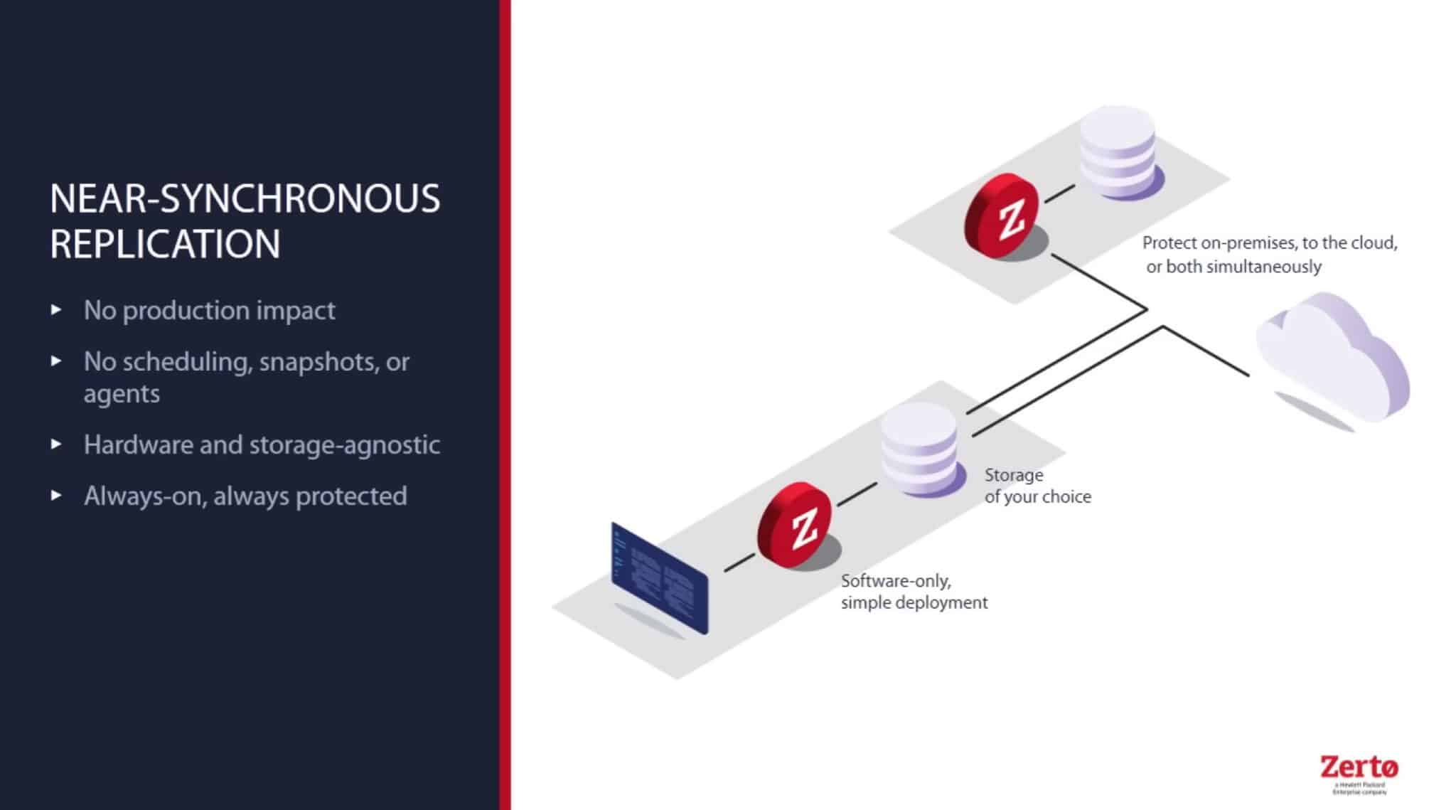 Zerto มีความสามารถในการทำสำเนาข้อมูลได้ในระดับ NEAR-SYNCHOROUS REPLICATION วิธีการของ zerto ไม่จำเป็นต้องติดตั้ง Agent ไม่ต้องทำ Snapshot VM ไม่ต้องมี Hardware ที่เหมือนกัน และไม่ต้องมี Network Bandwidth ที่สูง ก็สามารถทำได้