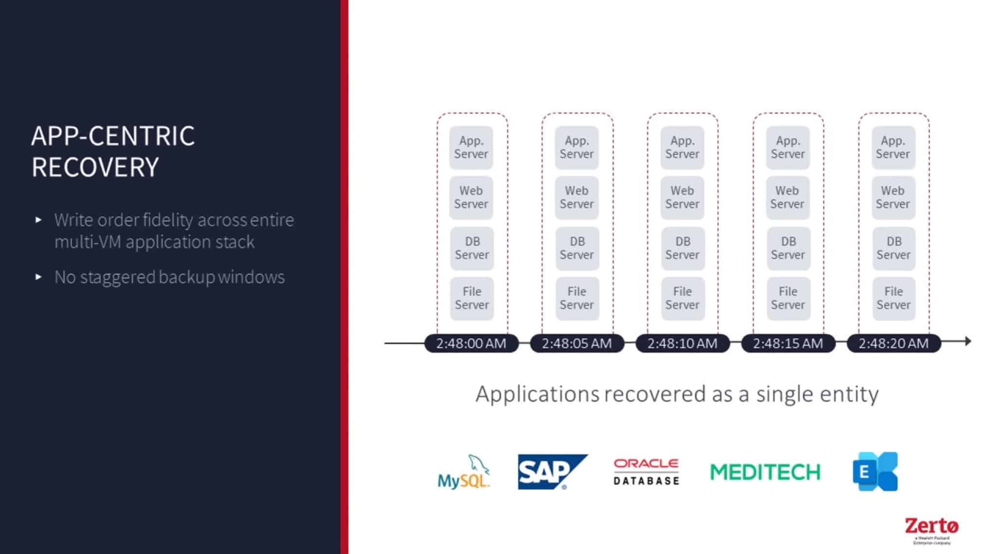 นอกจากนี้ ยังช่วยเรื่องของการแบคอัพทั้งระบบให้สมบูรณ์มากยิ่งขึ้น โดยใน 1 ระบบไม่ได้มีแค่ VM เดียว แต่จะมีหลายๆ vm หลายๆส่วน ทำให้แต่ละ VM มี แบ็คอัพหรือ TimeStamp ที่ไม่ตรงกัน พอไปทำแบ็คอัพมา ข้อมูลอาจจะใช้งานไม่ได้ เพราะมันไม่ sync กัน ซึ่งสิ่งที่ Zerto ทำคือ Protection Group รวมทุก VM ให้กลายเป็น TimeStamp เดียวกัน ข้อมูลที่ได้ จึงการันตีว่าจะสามารถทำงานได้อย่างสมบูรณ์แบบแน่นอน