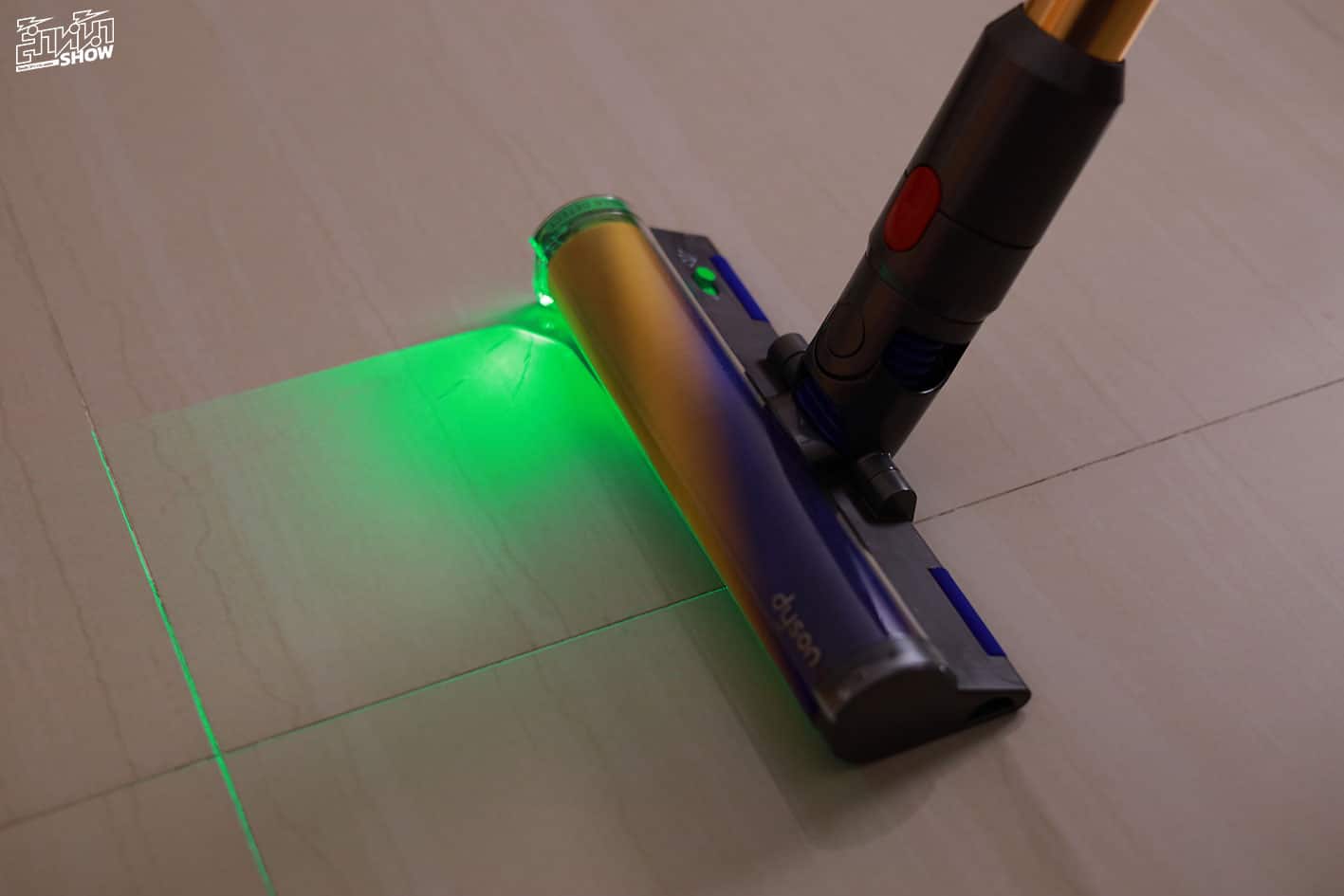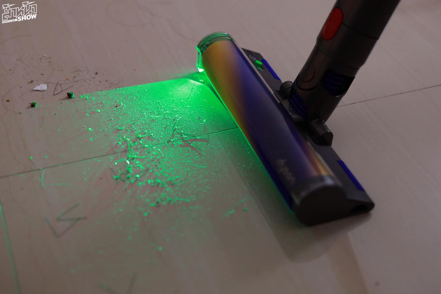 เลเซอร์สีเขียว ช่วยตรวจจับฝุ่นบนพื้นที่มองไม่เห็น เป็นเทคโนโลยีเลเซอร์ไดโอดสีเขียวในหัวดูดทำความสะอาด Slim Fluffy ซึ่งจะส่องแสงทำมุม 1.5 องศา ห่างจากพื้น 7.3 มม. การทำงานของเลเซอร์ จะฉายแสงในมุมมอง ซึ่งแสงจะทำมุมตกกระทบเข้ากับฝุ่นได้อย่างเหมาะเจาะ ทำให้มองเห็นเม็ดฝุ่นเป็นสีเขียว ได้อย่างชัดเจน ช่วยให้ทำความสะอาดอย่างทั่วถึงมากยิ่งขึ้น