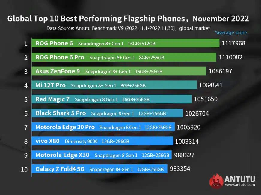 AnTuTu ได้สรุปผลคะแนน 10 อันดับสมาร์ทโฟน ที่ทำผลการ Benchmark ได้มากที่สุด ในช่วงเดือนพฤศจิกายน 2022 ปรากฎว่าเป็น 3 อันดับแรกเป็นสมาร์ทโฟนของ ASUS ที่ใช้ชิป Qualcomm Snapdragon 8+ Gen1 ทั้งหมด โดยทำคะแนนเฉลี่ยได้มากกว่า 1 ล้านคะแนน