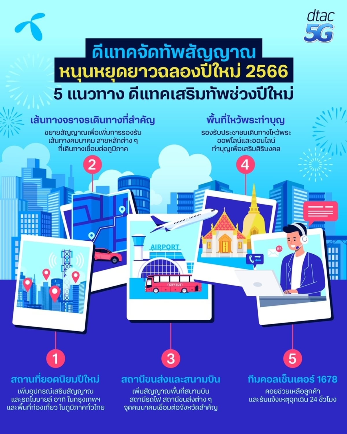 ดีแทคจัดทัพพร้อมให้บริการมือถือเพื่อรองรับเทศกาลปีใหม่ 2566 โดยอินเทอร์เน็ตความเร็วสูงมีความสำคัญในการติดต่อสื่อสารรวมถึงช่วงเฉลิมฉลองสู่ปีใหม่และท่องเที่ยว ดีแทคได้มุ่งขยายสัญญาณ 5G อย่างต่อเนื่องด้วยคลื่น 700 MHz ซึ่งครอบคลุมทั้งหมด 77 จังหวัดแล้วภายในครึ่งปีแรกที่ผ่านมา และติดตั้งสถานีฐานบนเครือข่าย 5G เพิ่มขึ้นโดยมีทั้งสิ้นประมาณ 18,800 สถานีฐาน (ข้อมูลไตรมาส 3/2565) ซึ่งดีแทคเห็นความสำคัญในพฤติกรรมใช้งานดิจิทัลทั้งชาวไทยและต่างประเทศ รวมถึงการที่ไทยถูกจัดอันดับเมืองที่น่าทำงานของชาว Digital Nomad เช่น เชียงใหม่ติดอันดับ 3 ของ The 16 Best Cities For Digital Nomads To Explore ในปี 2565 ของ By Digital Nomad เป็นต้น จึงได้ขยายสัญญาณรองรับพฤติกรรมการใช้งานที่ครอบคลุมทุกรูปแบบ