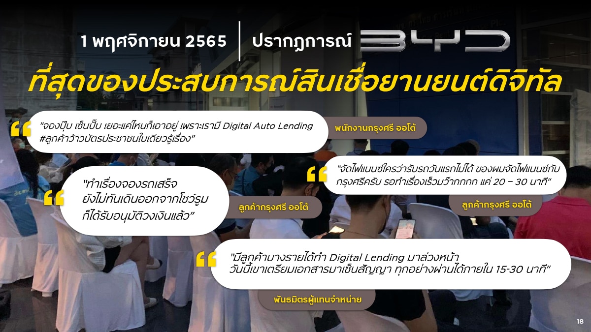 มีกรณีที่น่าสนใจอย่าง BYD แบรนด์รถยนต์ไฟฟ้า ที่มีกระแสตอบรับในประเทศไทยอย่างมาก เมื่อวันที่ 1 พฤศจิกายนที่ผ่านมา ได้เปิดจอง รถยนต์รุ่น ATTO 3 เป็นวันแรก ทางกรุงศรี ออโต้ สามารถให้ประสบการณ์ในการขอสินเชื่อผ่าน Digital Lending ที่รวดเร็ว ลูกค้าหลายคนมีการทำสินเชื่อล่วงหน้ามาเรียบร้อยก่อนเปิดจอง ทำให้สามารถดำเนินการจองซื้อรถได้อย่างรวดเร็วท่ามกลางความต้องการของลูกค้าจำนวนมาก