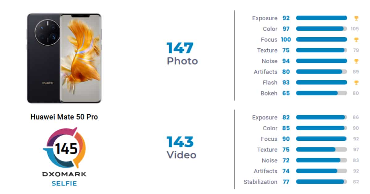 นอกจากจะได้รับคะแนนกล้องเซลฟี่สูงสุดแล้ว HUAWEI Mate 50 Pro ยังเป็นสมาร์ทโฟนที่ได้คะแนนกล้องหลังมากที่สุดจาก DxOMark โดยทำคะแนนรวมได้ 149 คะแนน