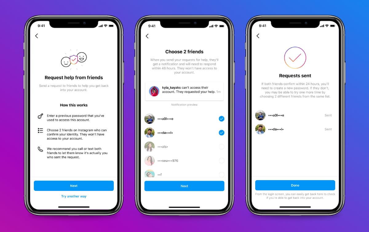 Instagram ยังมีตัวเลือก Request help from friends เพื่อให้ผู้ใช้สามารถกลับมาใช้งานบัญชีนั้นๆ ได้อีกครั้ง โดยให้ผู้ใช้เลือกเพื่อนได้ 2 คนเพื่อช่วยยืนยันตัวตน
