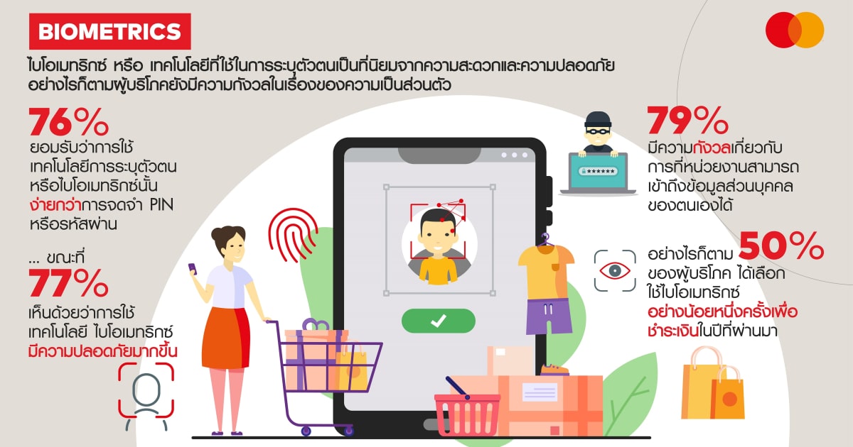 ข้อมูลล่าสุดทั้งในด้านพฤติกรรม ทัศนคติ และความชื่นชอบด้านการใช้จ่าย จากผลสำรวจความคิดเห็นผู้บริโภคของ Mastercard’s second annual New Payments Index จาก 40 ประเทศใน 5 ภูมิภาค รวมถึง 7 ประเทศในเอเชียแปซิฟิก ได้แก่ เวียดนาม ออสเตรเลีย จีน อินเดีย ญี่ปุ่น นิวซีแลนด์ และไทย แสดงให้เห็นว่าผู้บริโภคชาวไทยมากถึง 50% ใช้ระบบไบโอเมทริกซ์ในการซื้อสินค้าและบริการเมื่อปีที่ผ่านมา ซึ่งมีอัตราเกือบเทียบเท่าค่าเฉลี่ยของผู้บริโภคในเอเชียแปซิฟิกซึ่งอยู่ที่ 53% ที่ใช้ระบบนี้ในการซื้อสินค้าและบริการในช่วงเวลาเดียวกัน