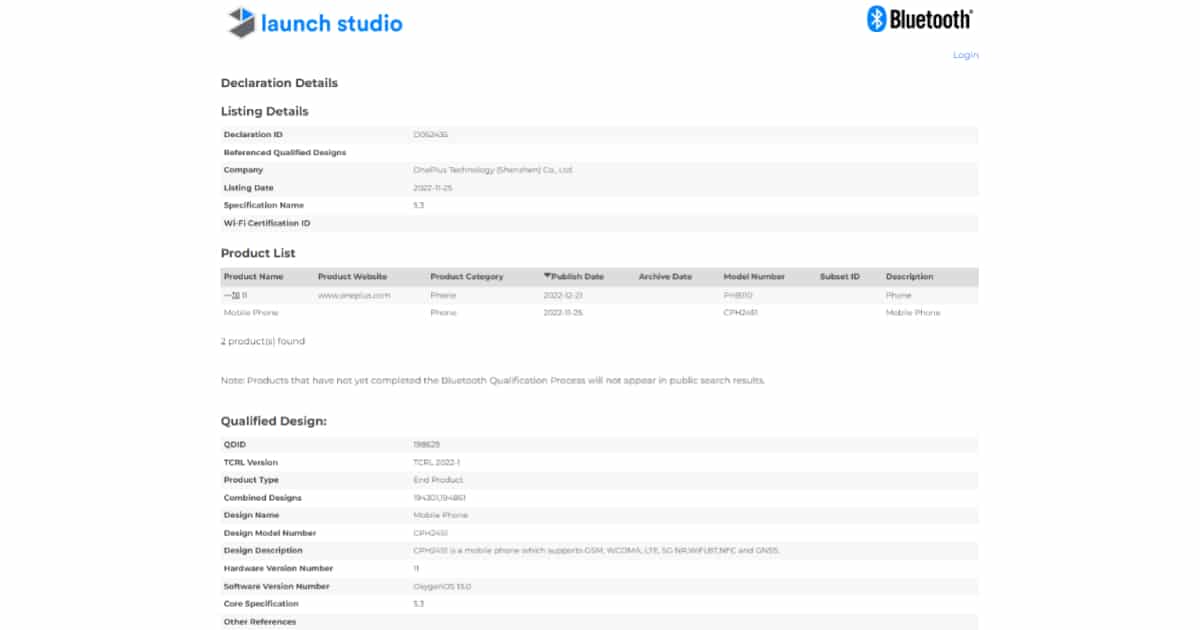 รายการ Bluetooth เผยให้เห็นว่าอุปกรณ์รองรับการเชื่อมต่อ Bluetooth 5.3 นอกจากนี้ ยังบอกว่ารุ่นที่จะวางขายทั่วโลกนั้นรันบน OxygenOS 13
