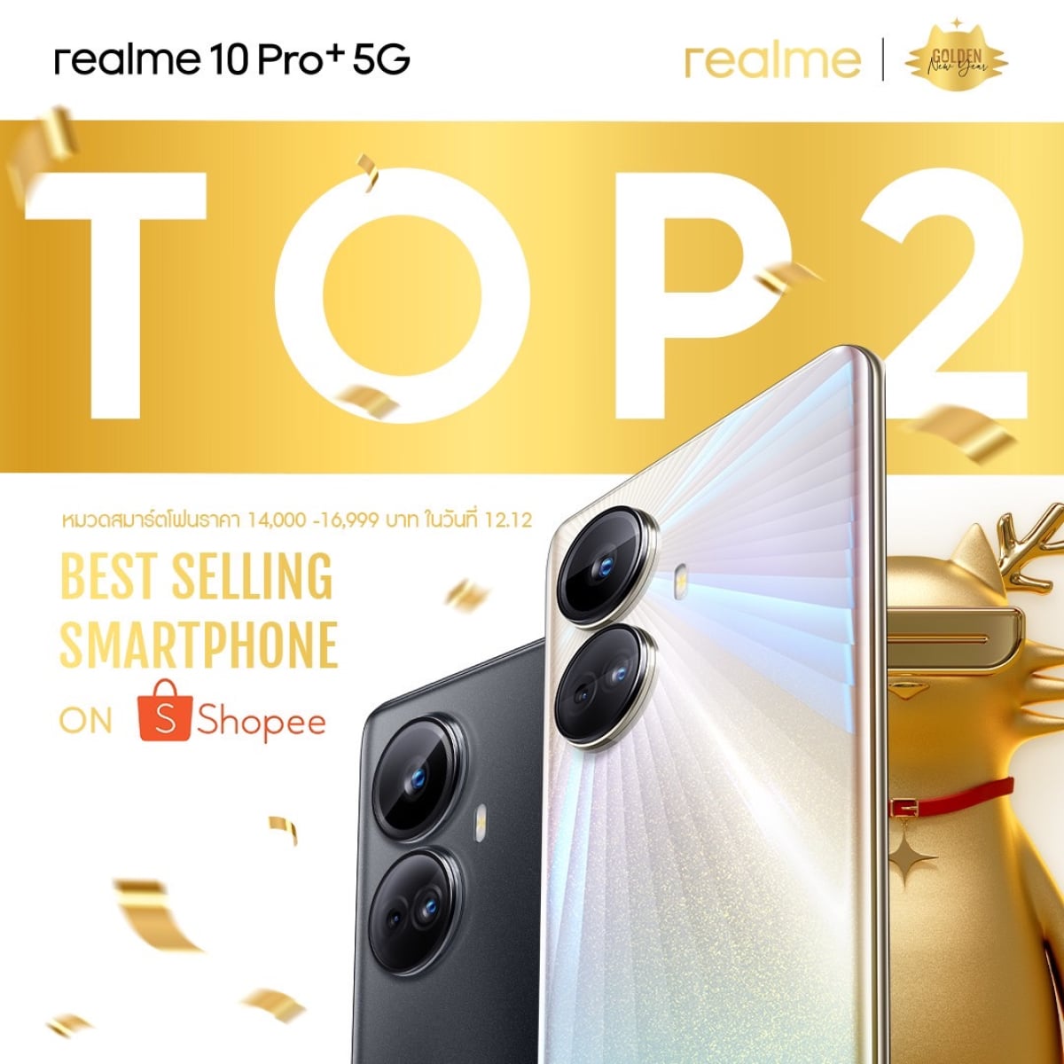 realme แบรนด์สมาร์ตโฟนเพื่อคนรุ่นใหม่ที่เติบโตเร็วที่สุดในโลก ฉลองความสำเร็จยอดขายออนไลน์สูงทะลุเป้าติดอันดับ Top 2 ใน Shopee ในช่วงเทศกาล 12.12 ที่ผ่านมา พร้อมประกาศวางจำหน่ายสมาร์ตโฟนรุ่นใหม่ที่เพิ่งเปิดตัวไป “realme 10 Pro Series” ที่แบรนด์ช็อปทั่วประเทศพร้อมกันในวันที่ 17 ธันวาคมนี้ อีกทั้งยังมอบกิจกรรมแห่งความสุขส่งท้ายปีไปกับ realme 10 Pro Series Let it Gold!