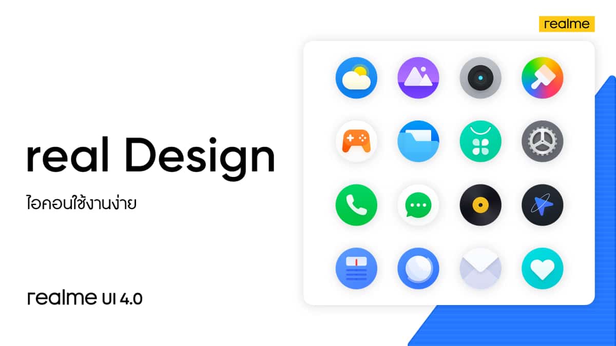 การมีปฏิสัมพันธ์ของผู้ใช้กับแอปต่าง ๆ ในการใช้งานระหว่างวัน realme UI 4.0 จึงออกแบบชุดไอคอนใหม่เพื่อให้ผู้ใช้รู้ว่าเป็นแอปอะไรได้ตั้งแต่แวบแรกที่เห็น โดยออกแบบการวางเลย์เอาต์ไอคอนแบบการ์ด รวมชุดข้อมูลในส่วนต่าง ๆ เข้าด้วยกัน และการออกแบบแผงควบคุมใหม่ไว้บน “การ์ด” เหล่านี้ นอกจากนี้ ผู้ใช้ยังสามารถปรับแต่งแผงควบคุมบนการ์ดเพื่อเรียกดูข้อมูลที่ต้องการได้อย่างรวดเร็ว realme UI 4.0 ยังมีวอลล์เปเปอร์ลายดอกไม้แสนสวยและนาฬิกาแบบเงาสะท้อนสุดเท่ให้อินเตอร์เฟซมีการเคลื่อนไหวที่สวยงาม