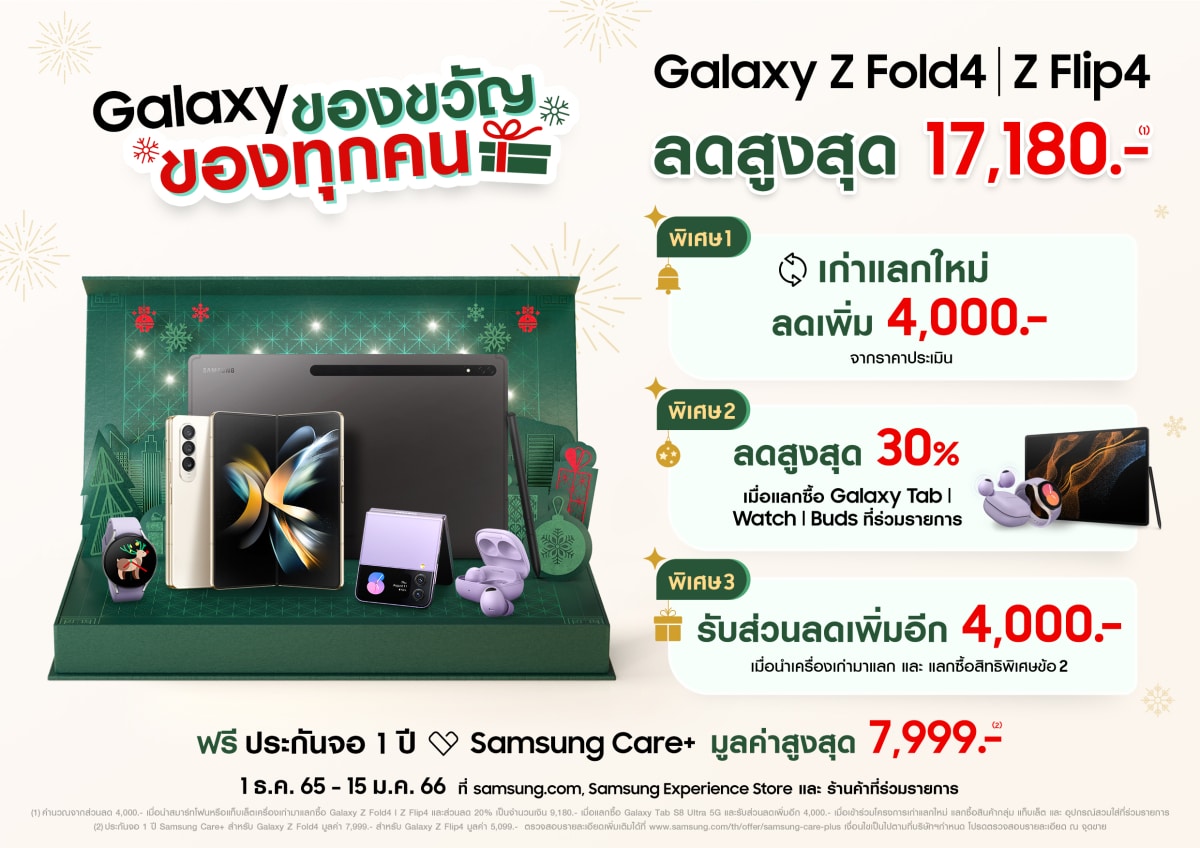 แคมเปญ “Galaxy ของขวัญของทุกคน” เริ่มแล้ววันนี้ถึง 15 ม.ค. 2566 (ยกเว้นเงื่อนไขของรุ่น A Series ลดถึงวันที่ 8 ม.ค. 2566 เท่านั้น) ที่ samsung.com, Samsung Experience Store และร้านค้าที่ร่วมรายการ
