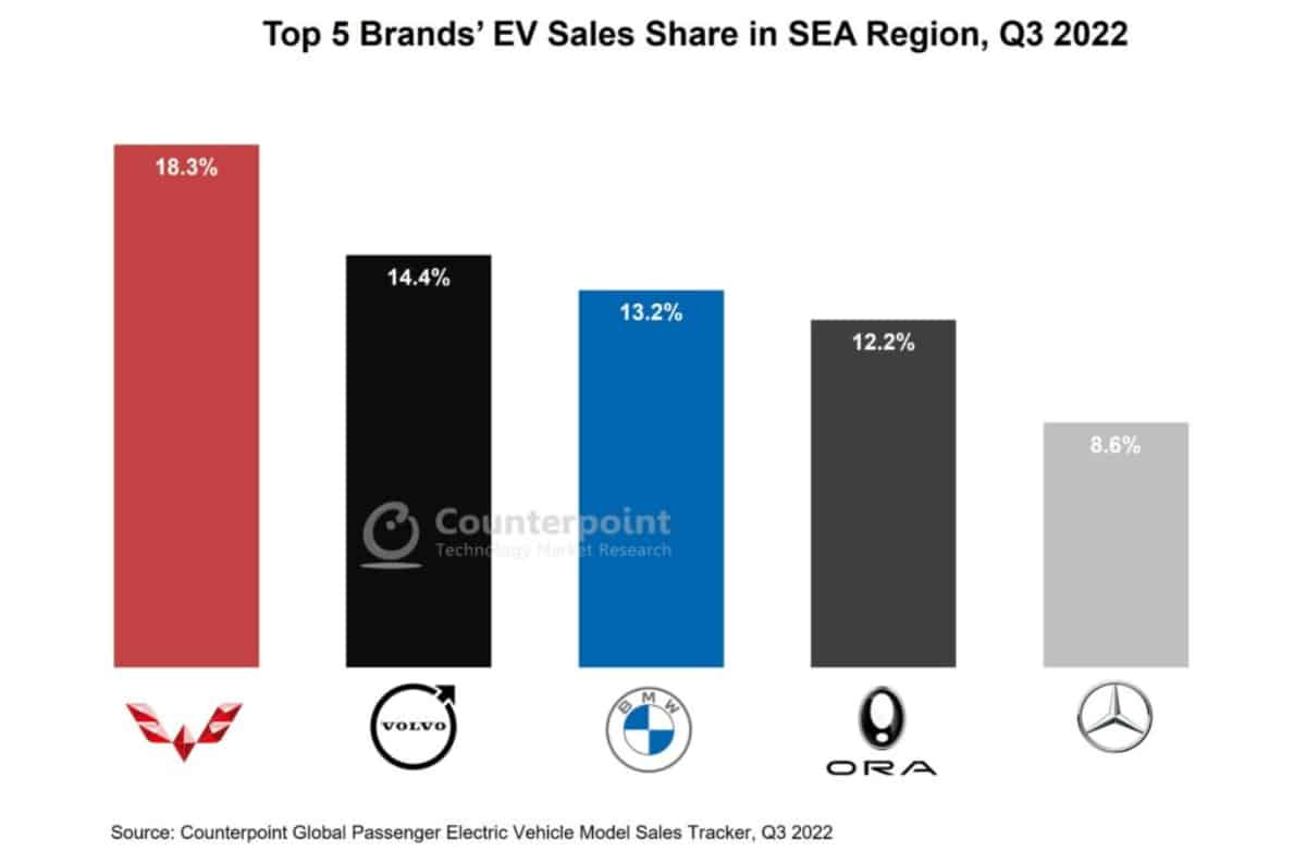 แบรนด์รถยนต์ไฟฟ้า top 5 มีสัดส่วนถึง 67% ของยอดขายรถ EV ในภูมิภาคเอเชียตะวันออกเฉียงใต้ โดย Wuling เป็นแบรนด์ที่ขายดีที่สุด ตามด้วย Volvo และ BMW