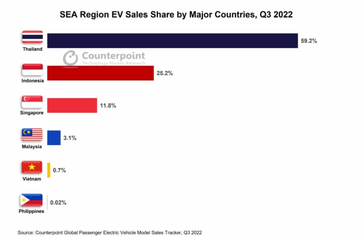 ประเทศไทยเป็นประเทศที่มียอดขายรถ EV สูงที่สุดในภูมิภาค โดยครองส่วนแบ่งถึง 60% รองลงมาคืออินโดนีเซียและสิงคโปร์