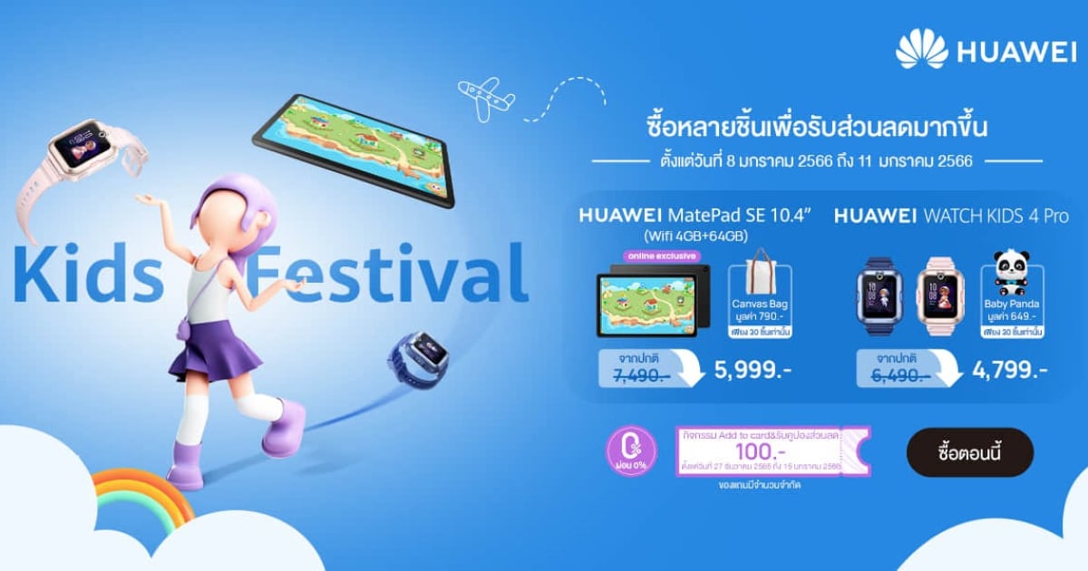 HUAWEI จัด โปรโมชัน วันเด็ก มอบส่วนลดสูงสุด 29% กดสั่งซื้อเลย ยิ่งซื้อยิ่งคุ้ม ตั้งแต่ 8 – 11 มกราคม 2566 นี้เท่านั้น