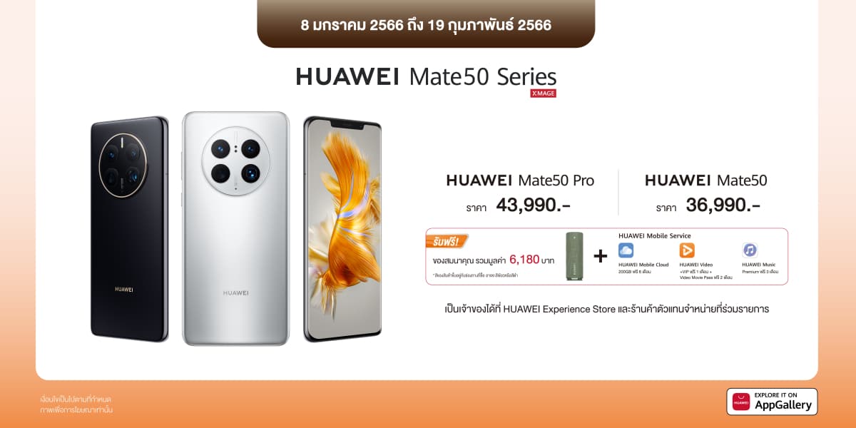 HUAWEI Mate 50 วางจำหน่ายที่ราคา 36,990 บาท ส่วน HUAWEI Mate 50 Pro วางจำหน่ายที่ราคา 43,990 บาท และพิเศษกับโปรโมชัน Perfect Moment Together รับทันที! หูฟัง HUAWEI SoundJoy มูลค่า 4,999 บาท และบริการ HUAWEI Mobile Services รวมมูลค่า 1,181 บาท ได้แก่ บริการ Huawei Cloud ขนาด 200 GB ฟรี 6 เดือน มูลค่า 594 บาท, บริการ Huawei Music ระดับ Premium ฟรี 3 เดือน มูลค่า 387 บาท, บริการ Huawei Video ระดับ VIP ฟรี 1 เดือน และรับ Video Movie Pass ฟรี 2 เดือน มูลค่า 200 บาท เมื่อซื้อสินค้าที่หน้าร้าน HUAWEI Experience Store และร้านค้าอื่น ๆ ที่ร่วมรายการ ตั้งแต่วันที่ 8 มกราคม 2566 ถึงวันที่ 19 กุมภาพันธ์ 2566