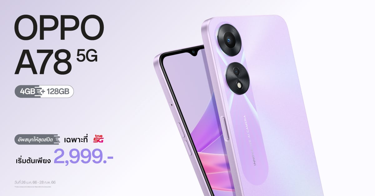 “OPPO A78 5G รุ่น 4GB” สมาร์ตโฟนพร้อมอัพสนุกให้สุดสปีด ราคาเริ่มต้นเพียง 2,999 บาท ที่ ทรูช็อป ทั่วประเทศ ถึง 28 ก.พ. นี้