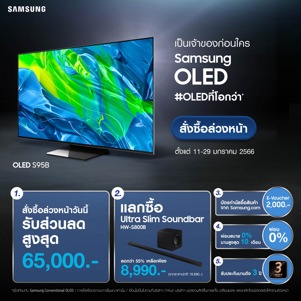 Samsung OLED สุดยอดเทคโนโลยี ทีวีพรีเมียม สัมผัสประสบการณ์การรับชมที่โอกว่าได้ก่อนใคร สั่งซื้อออนไลน์ล่วงหน้ารุ่น 55 และ 65 นิ้ว กับสิทธิพิเศษ กว่า 5 ต่อ! 11 – 29 มกราคมนี้