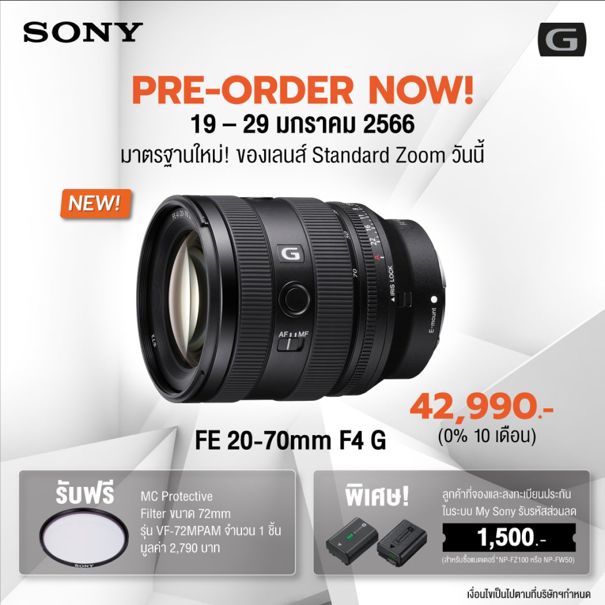 เลนส์ FE20-70mm F4 G (รุ่น SEL2070G) พร้อมเปิดให้ผู้สนใจสั่งจองตั้งแต่วันที่ 19 ถึง 29 มกราคม ศกนี้ ในราคา 42,990 บาท พร้อมรับของสมนาคุณ MC Protective Filter ขนาด 72 ม.ม. ของโซนี่ มูลค่า 2,790 บาท และรับรหัสส่วนลด 1,500 บาท สำหรับซื้อแบตเตอรี่โซนี่รุ่น NP-FZ100 หรือ NP-FW50 จำนวน 1 ก้อน เมื่อลงทะเบียนประกันในระบบสมาชิก My Sony