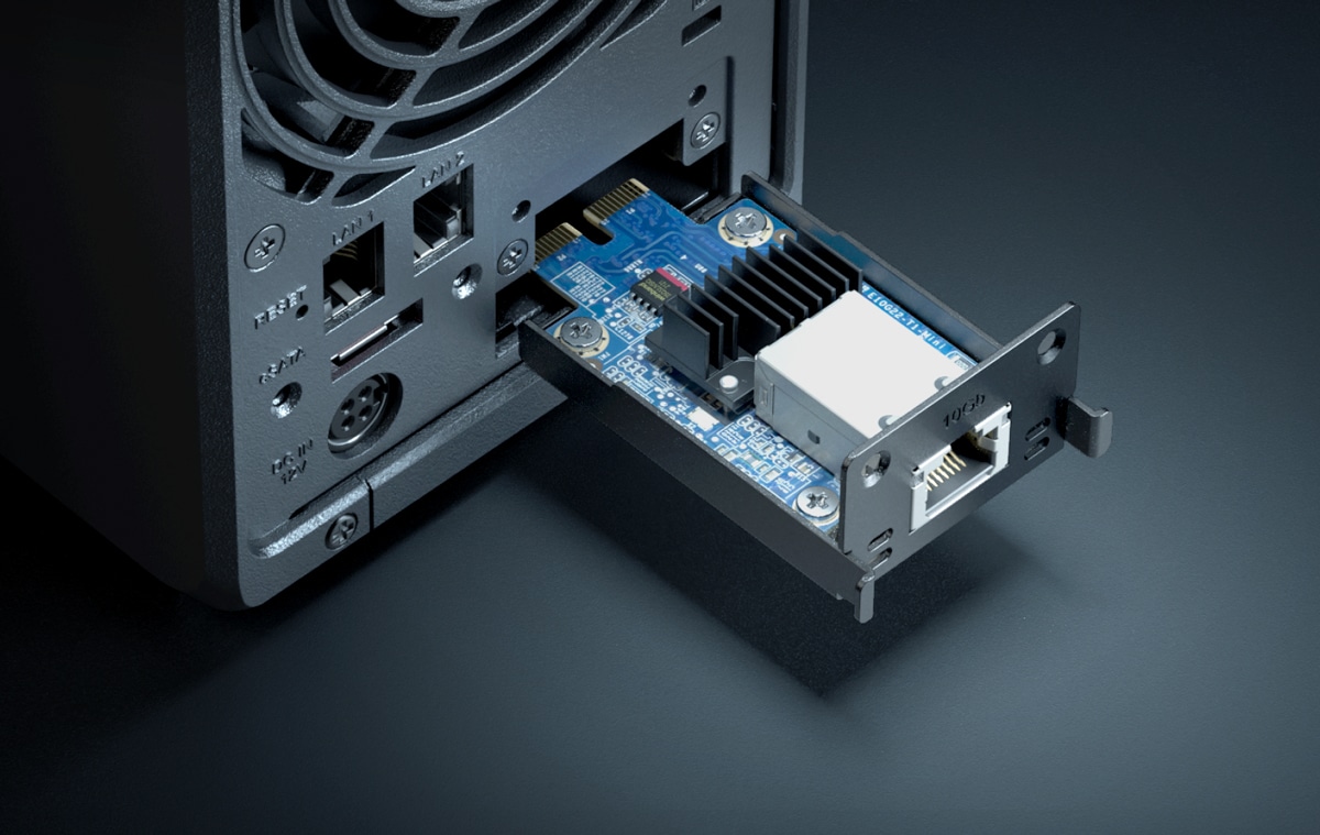 นอกจากนี้ผู้ใช้ยังสามารถอัปเกรดประสิทธิภาพด้วยตัวเลือกในการเพิ่มการเชื่อมต่อ 10GbE และไดรฟ์ M.2 NVMe SSD ผ่านสล็อต PCIe ในตัว เพื่อเปิดใช้งานการแคชอย่างรวดเร็วหรือสร้างพูลพื้นที่จัดเก็บข้อมูลแบบ all-flash เพิ่มเติม