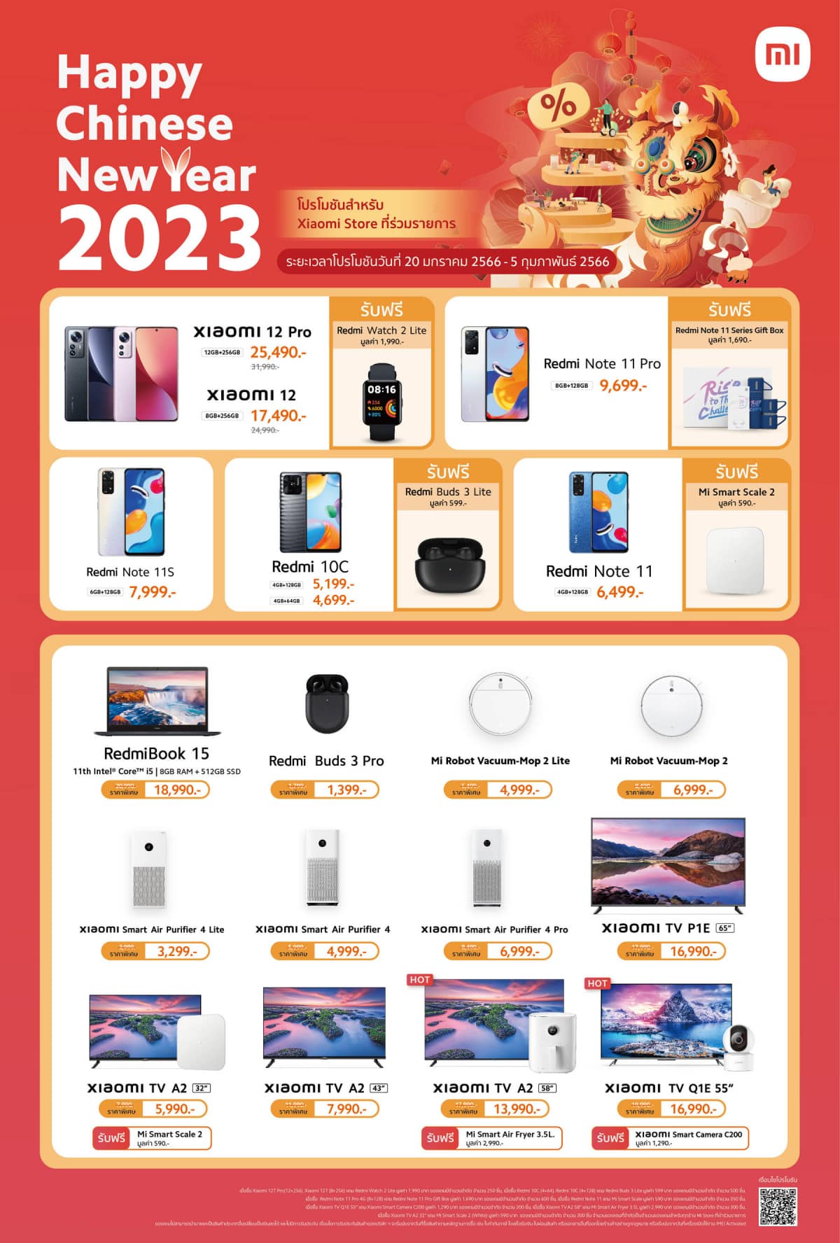 อย่าพลาด! โปรโมชันสุดพิเศษรับเทศกาล Chinese New Year 2023 สำหรับลูกค้าที่ซื้อสินค้าในระหว่างวันที่ 20 มกราคม 2566 ถึง 5 กุมภาพันธ์ 2566 ที่ Xiaomi Store หรือร้านตัวแทนจำหน่ายที่ร่วมรายการทั่วประเทศ