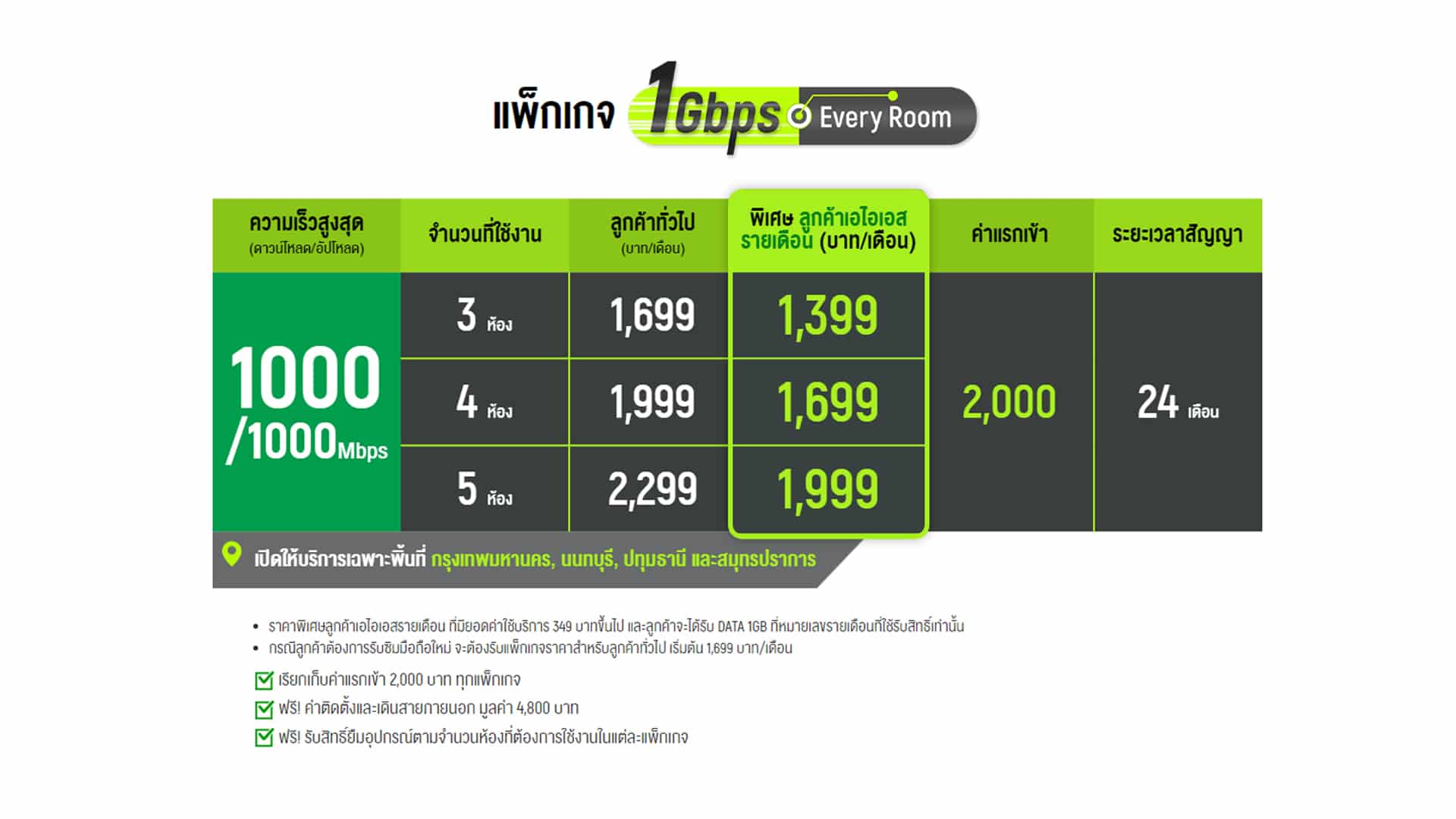 สำหรับบริการ 1Gbps Every Room จะเปิดให้บริการลูกค้าในเขตพื้นที่กรุงเทพฯ และปริมณฑล พร้อมแพ็กราคาสุดคุ้มค่า แพ็คเกจเริ่มต้นสำหรับประสบการณ์การใช้งานที่รองรับความเร็วระดับ 1Gbps ทุกพื้นที่มากถึง 3 ห้องภายในบ้าน เพียง 1,399 บาทต่อเดือน และยังมีแพ็กเกจอื่นๆ ที่รองรับรองรับความเร็วระดับ 1Gbps มากสุดได้ถึง 8 ห้อง