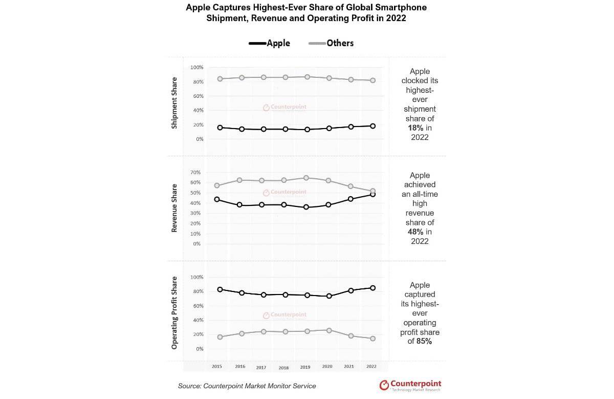 ตามรายงานจาก Counterpoint Research เผยว่า Apple นั้นมีส่วนแบ่งผลกำไรจากการดำเนินงานในตลาดสมาร์ทโฟนทั่วโลกสูงกว่า 85% และบริษัทยังมียอดจัดส่ง iPhone สูงถึง 70 ล้านเครื่องในไตรมาสที่ 4 ของปี 2022 ด้วย