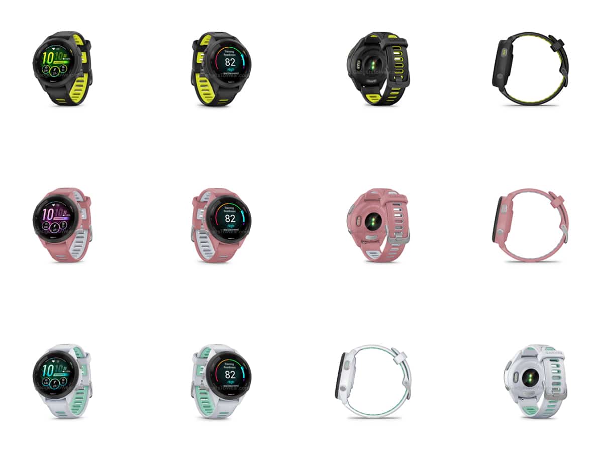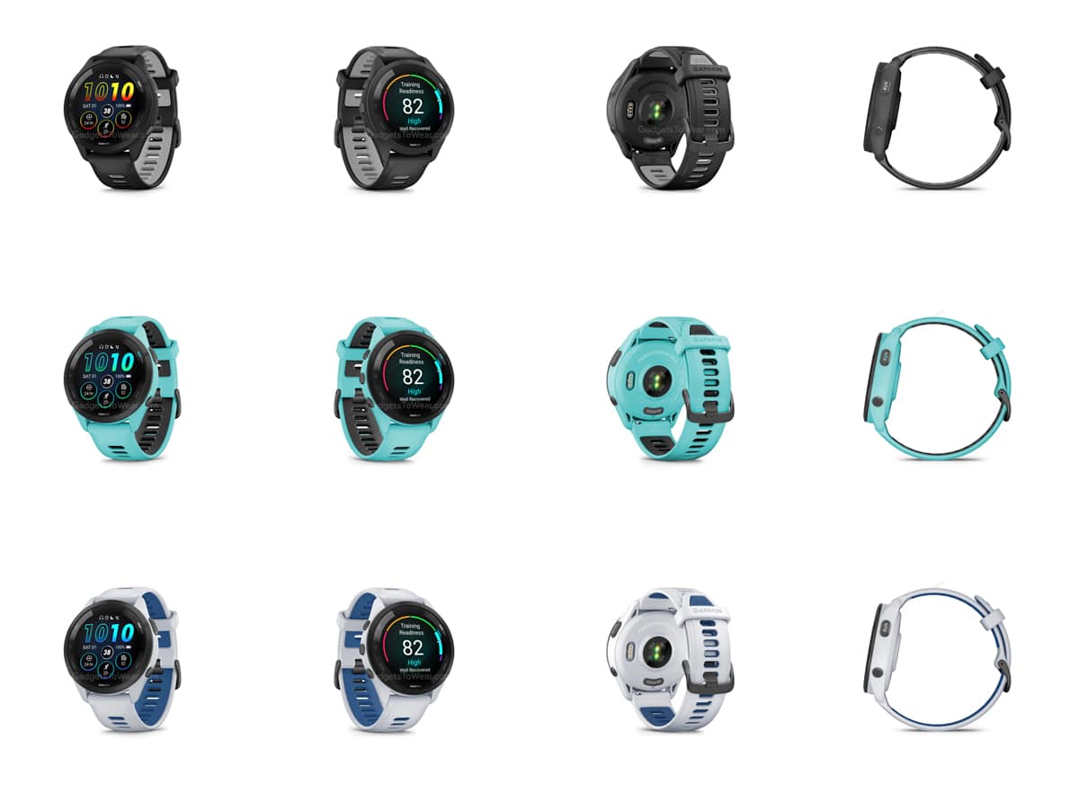 สำหรับ Forerunner 265 ดีไซน์ของสายจะเป็นแบบทูโทน มีทั้งหมด 3 สีด้วยกันคือ Black / powder gray, Whitestone / tidal blue, Aqua / black
