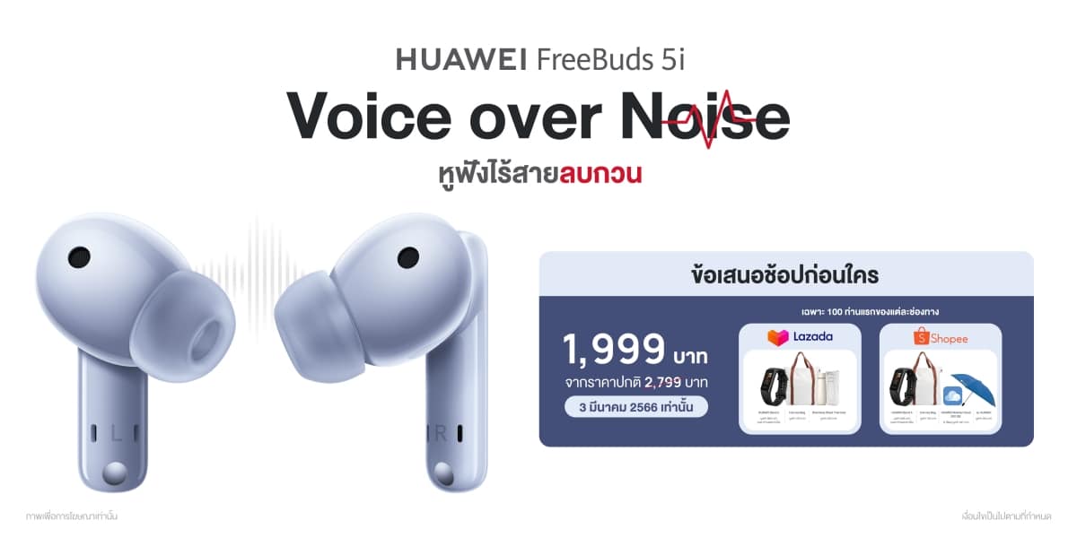 หากใครสนใจเป็นเจ้าของ HUAWEI FreeBuds 5i หูฟังไร้สายตัวตึงที่น่าจับตาแห่งปี สามารถสั่งซื้อได้ที่ HUAWEI Store ใน ราคา เพียง 2,499 บาท จากราคาปกติ 2,799 บาท ตั้งแต่วันที่ 3 มีนาคม 2566 – 15 มีนาคม 2566 พิเศษกับโปรโมชัน 3.3 ลดราคาเหลือเพียง 1,999 บาท เมื่อสั่งซื้อสินค้าผ่านร้านค้าอย่างเป็นทางการของหัวเว่ยบน Lazada และ Shopee ในวันที่ 3 มีนาคม 2566 เท่านั้น พร้อมของสมนาคุณจุใจดังต่อไปนี้: