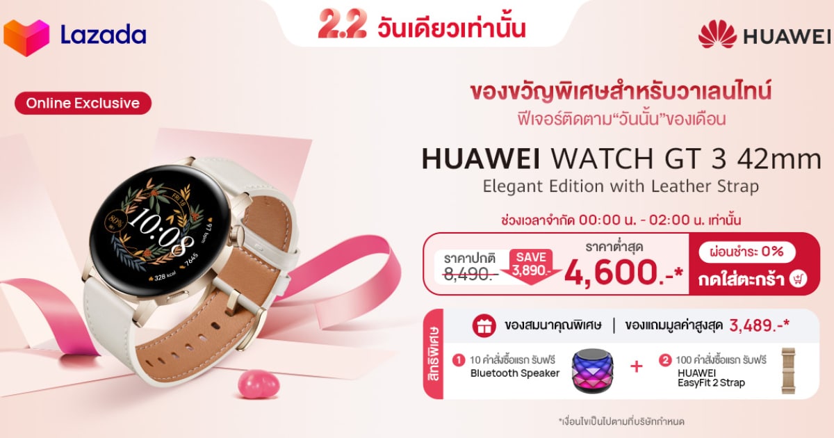 หัวเว่ย คอนซูมเมอร์ บิสสิเนส กรุ๊ป (ประเทศไทย) ร่วมกับ Lazada จัดแคมเปญ 2.2 Double Sale ฉลองเดือนแห่งความรักแนะนำแก็ตเจ็ตใหม่กับ HUAWEI WATCH GT 3 ขนาด 42 มม. รุ่น Elegant Edition สมาร์ทวอทช์ดีไซน์พรีเมียม อัดแน่นด้วยฟังก์ชั่นดูแลสุขภาพรองรับมากกว่า 100 โหมด ลดสูงสุด 46% นอกจากนี้ยังพบกับสมาร์ทวอทช์ หูฟัง ลำโพงอัจฉริยะ มอนิเตอร์ และสินค้าอื่น ๆ ที่ร่วมรายการจัดโปรสุดคุ้ม 3 ต่อ ลด แลก แถม รีบกดใส่ตระกร้ารอได้แล้ววันนี้! ตามไปดูรายละเอียดโปรโมชันได้ด้านล่างนี้เลย