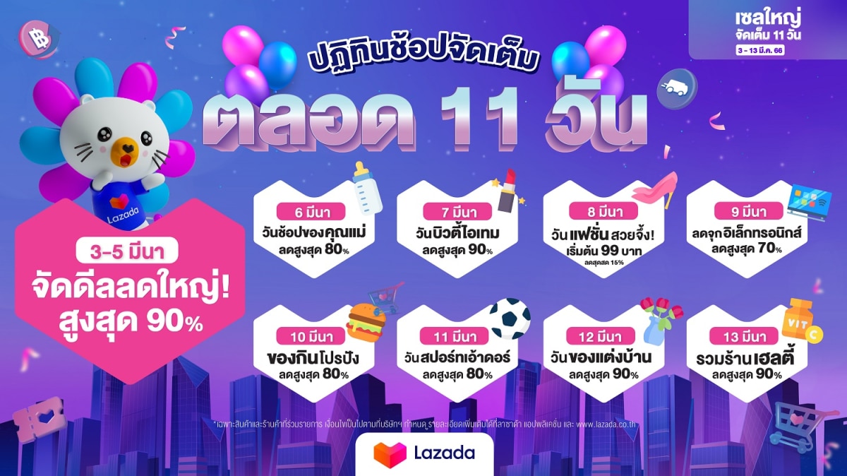 ลาซาด้า (Lazada) ผู้บุกเบิกแพลตฟอร์มอีคอมเมิร์ซในเอเชียตะวันออกเฉียงใต้ เตรียมเปิดฉากมหกรรมช้อปปิงสนั่นเมืองกับแคมเปญ “เซลใหญ่จัดเต็ม 11 วัน” ระหว่างวันที่ 3 – 13 มีนาคม 2566 เดินหน้าส่งต่อความสุขและยกระดับประสบการณ์การช้อปแบบจัดเต็มให้นักช้อปชาวไทยได้เพลิดเพลินกับโปรโมชันสุดคุ้มและดีลเด็ดสุดปังจากแบรนด์ดังมากมายที่ยกขบวนสินค้าราคาพิเศษมาให้ Add to cart กันอย่างจุใจ เต็มอิ่มถึง 11 วัน พลาดไม่ได้กับส่วนลดแรงถึง 6 ต่อ ส่งฟรีไม่มีขั้นต่ำ ดีลลดสูงสุดถึง 90% และโปรโมชันอื่น ๆ อีกมากมาย