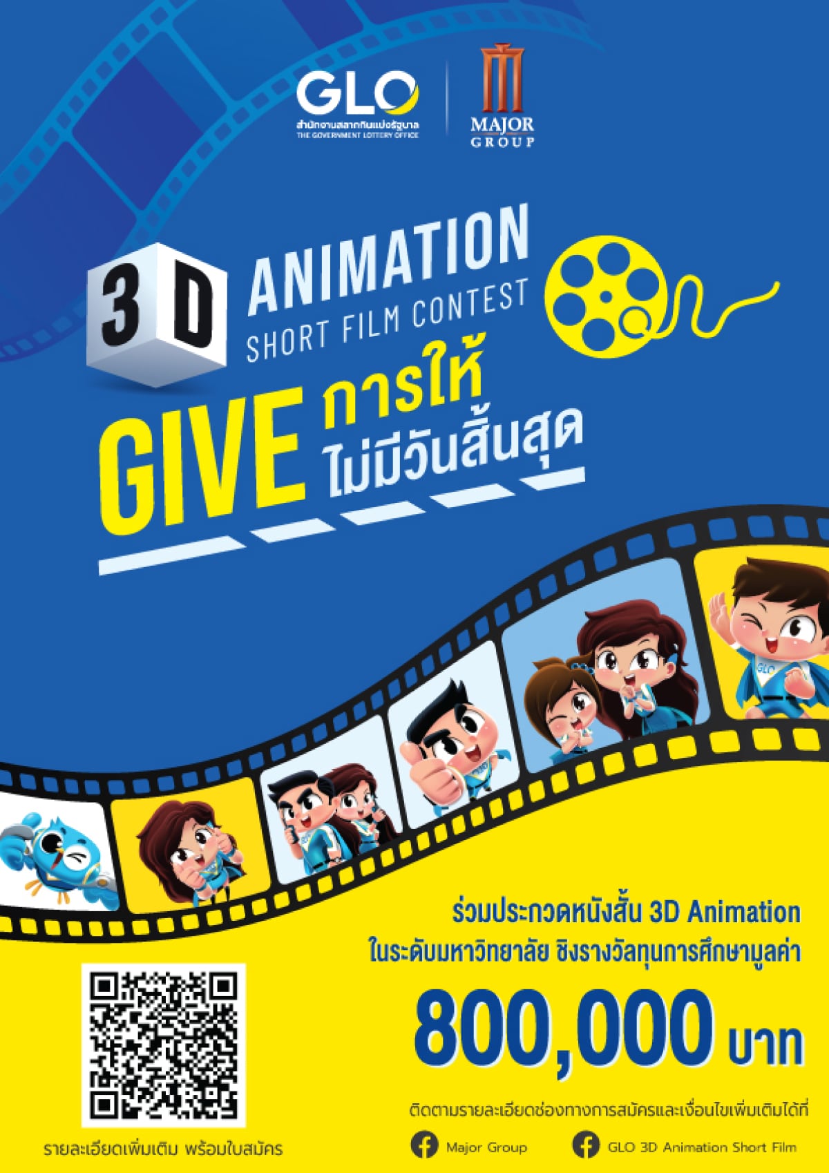 สำนักงานสลากกินแบ่งรัฐบาล ร่วมกับ บริษัท เมเจอร์ ซีนีเพล็กซ์ กรุ้ป จำกัด (มหาชน) เชิญชวนวัยรุ่น วัยมันส์ ปลุกไอเดียแบบเต็มกราฟ ผ่านผลงาน “3D ANIMATION SHORT FILM CONTEST” เปิดพื้นที่ให้กลุ่มคนรุ่นใหม่ นิสิต นักศึกษา จากมหาวิทยาลัยทั่วประเทศได้แสดงออกถึงจินตนาการและความคิดสร้างสรรคโชว์ลวดลายอวดดีไซน์สุดครีเอท ภายใต้แนวคิด “Give การให้ ไม่มีวันสิ้นสุด” ชิงรางวัลทุนการศึกษามูลค่า 800,000 บาท