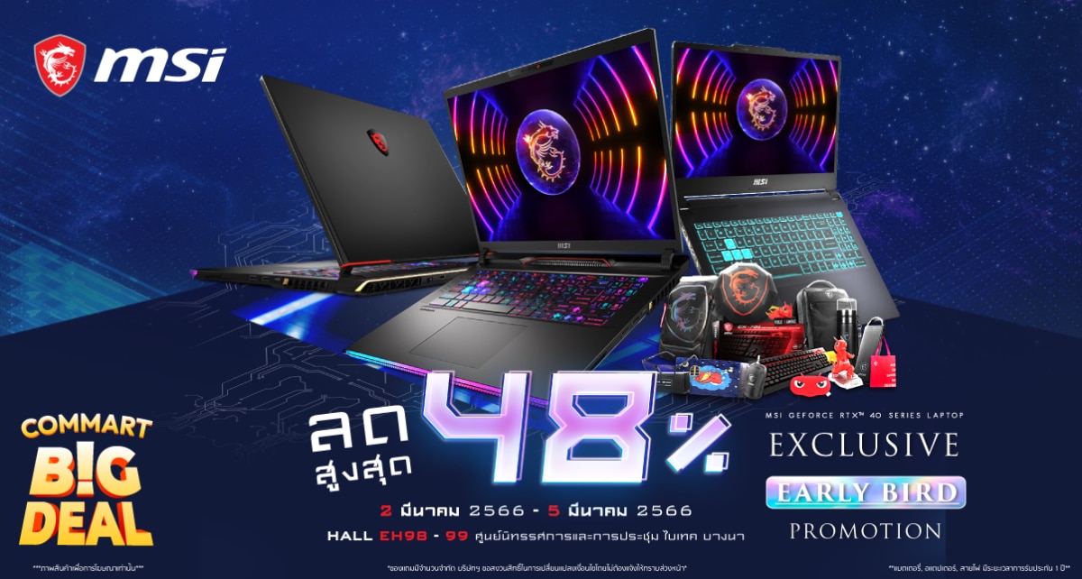 MSI ร่วมงาน Commart Big Deal 2023 ยกขบวนสินค้าตัวท็อปมาจัดโปรโมชันราคาพิเศษ พร้อมของแถมสุดพรีเมี่ยมหลายรายการ ที่ ศูนย์นิทรรศการและการประชุมไบเทค บางนา วันที่ 2 – 5 มี.ค. 2023