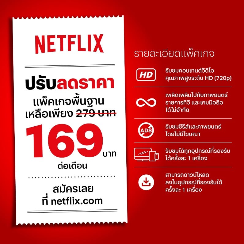 ท่ามกลางกระแสข่าวที่ Netflix เตรียมจัดการทุบบ้าน หรือการแชร์ Password ของลูกค้าที่ใช้แพ็กเกจ Family ล่าสุดได้มีการประกาศปรับลดราคาในแพ็คเกจพื้นฐาน หรือ Basic Plan จากเดิมราคาค่าบริการเดือนละ 279 บาท ลดลงมา เหลือ 169 บาท