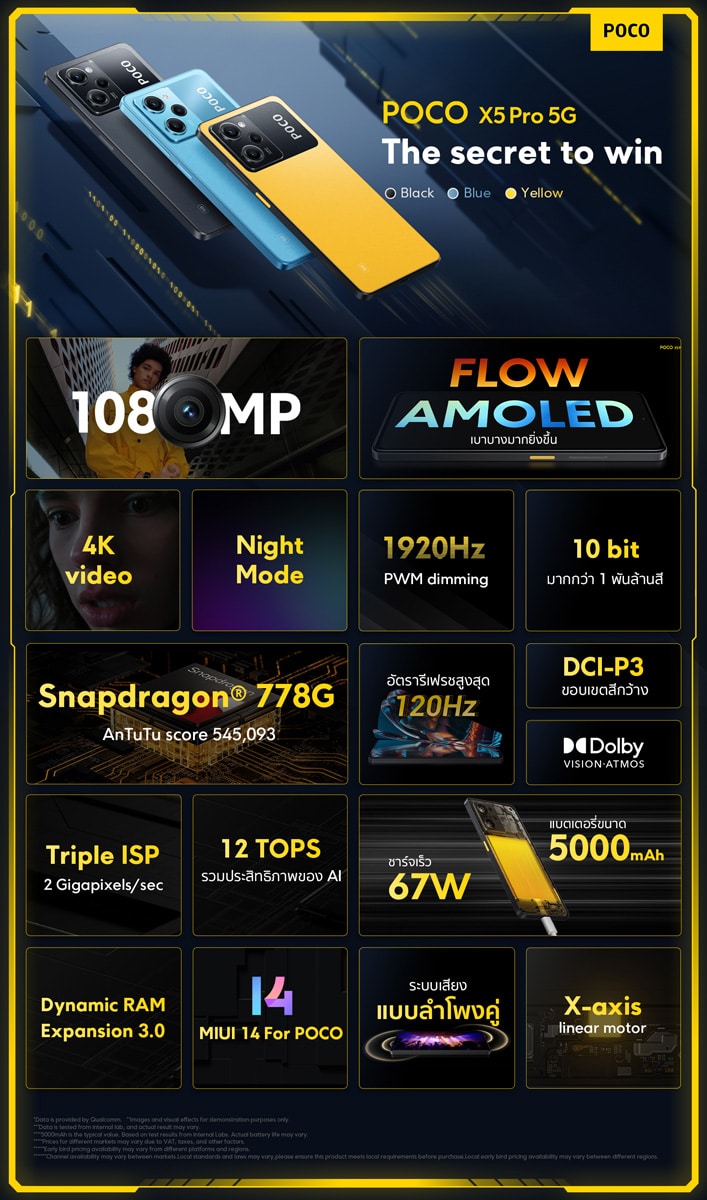 - POCO X5 Pro 5G ได้รับการอัปเกรดฟังก์ชั่นกล้อง ประมวลผลที่เร็วขึ้น และมาพร้อมกับจอแสดงผลอันน่าทึ่ง