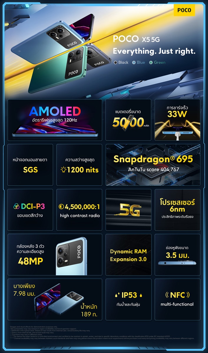 - POCO X5 5G ครบครันไปด้วยประสิทธิภาพรอบด้าน ไม่ว่าจะเป็นหน้าจออันยอดเยี่ยม ประสิทธิภาพที่แข็งแกร่ง และแบตเตอรี่ที่ใช้งานได้อย่างยาวนาน นับว่าเป็นการสร้างมาตรฐานใหม่ให้กับสมาร์ทโฟนระดับกลาง