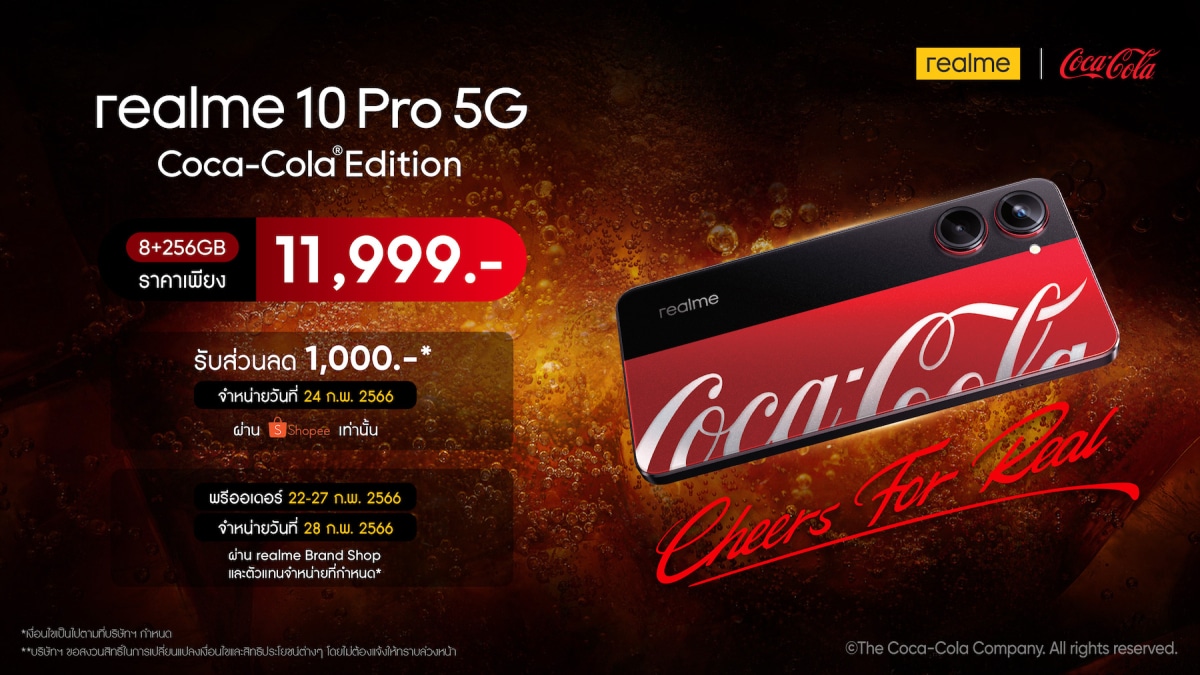 realme (เรียลมี) แบรนด์สมาร์ตโฟนเพื่อคนรุ่นใหม่ที่เติบโตเร็วที่สุดในโลก เปิดฉากปี 2566 ด้วยบิ๊กเซอร์ไพรส์กับการเปิดตัวสมาร์ตโฟนลิมิเต็ดอิดิชัน realme 10 Pro 5G Coca-Cola Edition สร้างปรากฏการณ์เขย่าวงการสมาร์ตโฟนทั่วโลกด้วยผลงานคอลแลบระดับโลกครั้งแรกกับแบรนด์เครื่องดื่มยักษ์ใหญ่ Coca-Cola® สร้างสรรค์สุดยอดสมาร์ตโฟนในดีไซน์ธีม Coca-Cola สุด ลิมิเต็ด ที่แปลกใหม่ไม่ซ้ำใคร ตอกย้ำการเป็นแบรนด์สมาร์ตโฟนที่มุ่งมั่นสร้างสรรค์เทรนด์การออกแบบและเทคโนโลยีใหม่ ๆ อยู่เสมอเพื่อตอบโจทย์การใช้งานและไลฟ์สไตล์ของคนรุ่นใหม่ภายใต้แนวคิด “Dare to Leap” ล่าสุด “ค่ายเรียลมี” ได้เดินหน้าสานต่อกลยุทธ์ Co-branding ชวน Coca-Cola® แบรนด์น้ำอัดลมสุดไอคอนิก ร่วมครีเอตสมาร์ตโฟน Limited Edition ดีไซน์หนึ่งเดียวในโลกมาเอาใจคนรักความคลาสสิกระดับตำนานของแบรนด์โค้ก ที่ผสานเข้ากับตัวตนของแบรนด์เรียลมีได้อย่างงดงามลงตัว หลังจากที่ก่อนหน้านี้ ค่ายเรียลมี ประสบความสำเร็จจากการคอลแลบกับทั้งภาพยนตร์ อนิเมะ และวงการเกมมิ่งมาแล้ว โดย realme 10 Pro 5G Coca-Cola® พร้อมให้สาวกเรียลมีและแฟน ๆ โค้กในไทยได้เป็นเจ้าของในราคา 11,999 บาท (รุ่น 8+256GB)
