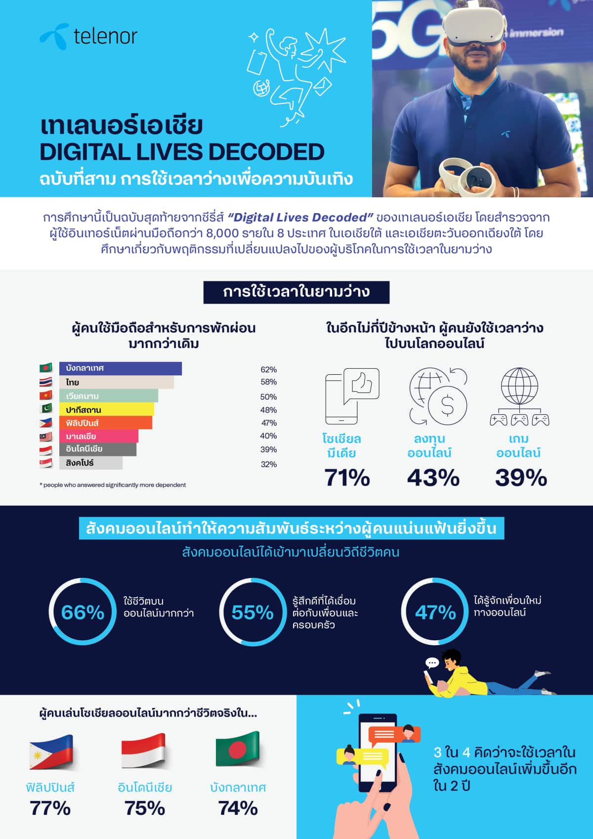 ผลสำรวจดังกล่าวเป็นส่วนหนึ่งของผลการศึกษาฉบับสุดท้ายจากซีรีส์ “Digital Lives Decoded” ของ Telenor Asia ซึ่งเปิดตัวในปี 2565 ในวาระครบรอบ 25 ปีของ เทเลนอร์เอเชีย ซีรีส์นี้พยายามทำความเข้าใจบทบาทของการเชื่อมต่อ มือถือ ในการใช้ชีวิต การทำงาน และการเข้าถึงความบันเทิงรูปแบบต่าง ๆ โดยสำรวจจากผู้ใช้อินเทอร์เน็ตผ่านมือถือกว่า 8,000 รายใน 8 ประเทศ ในเอเชียใต้ และเอเชียตะวันออกเฉียงใต้ (บังกลาเทศ อินโดนีเซีย มาเลเซีย ปากีสถาน ฟิลิปปินส์ สิงคโปร์ ไทย และเวียดนาม) รายงานดังกล่าวเจาะลึกพฤติกรรมที่เปลี่ยนแปลงไปของผู้บริโภคในการใช้เวลาในยามว่าง อันเนื่องมาจากความรู้ความเข้าใจด้านดิจิทัลเพิ่มขึ้นภายหลังการแพร่ระบาดของโควิด-19