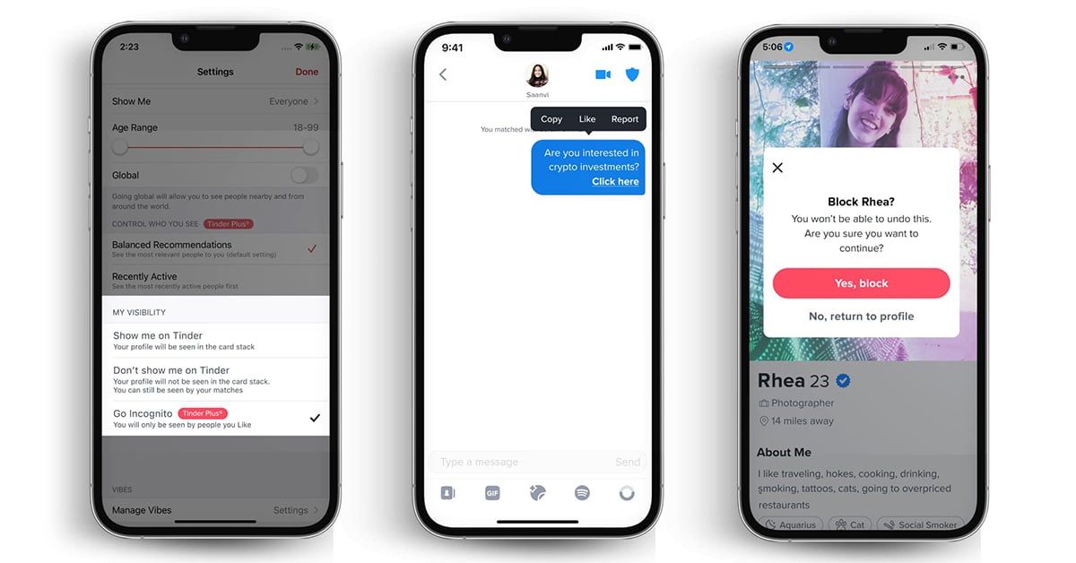 Tinder ได้เปิดตัวฟีเจอร์ใหม่ เพื่อให้สมาชิกสามารถควบคุมการมีส่วนร่วมกับผู้อื่นบนแอพได้มากขึ้นหลายวิธี ถือเป็น อีกส่วนหนึ่งของความพยายามอย่างต่อเนื่องของ Tinder ในการเป็นผู้นำการออกเดทอย่างปลอดภัย ดังนี้