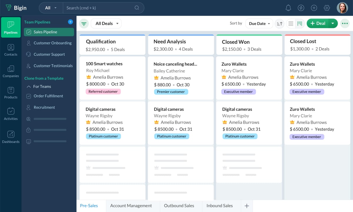 - Team Pipelines: ฟีเจอร์สำคัญที่สุดที่เพิ่มเข้าไปใน Bigin ก็คือ Team Pipelines ซึ่งผสานรวมการดำเนินงานในขั้นตอนที่เกี่ยวข้องกับลูกค้าที่หลากหลายแบบ 360 องศาไว้ในที่เดียว ช่วยให้ธุรกิจสามารถเชื่อมต่อกระบวนการสำคัญของลูกค้าไว้ได้ เช่น การจัดการดีล, Onboarding, การจัดส่ง การฝึกอบรม, การจัดการ Ticket, การขอคืนเงิน, คำรับรองจากลูกค้า ฯลฯ จึงมั่นใจได้ว่าธุรกิจขนาดเล็กจะสามารถจัดการขั้นตอนการดำเนินในแต่ละวันได้ด้วยวิธีการที่ง่ายกว่าเดิม นอกจากนี้ กลุ่มธุรกิจจะได้ใช้งาน CRM ที่สมบูรณ์แบบซึ่งไม่ได้มีแค่เรื่องการขายเท่านั้น แต่ยังมีแหล่งข้อมูลในการวิเคราะห์ข้อมูลลูกค้าอีกด้วย