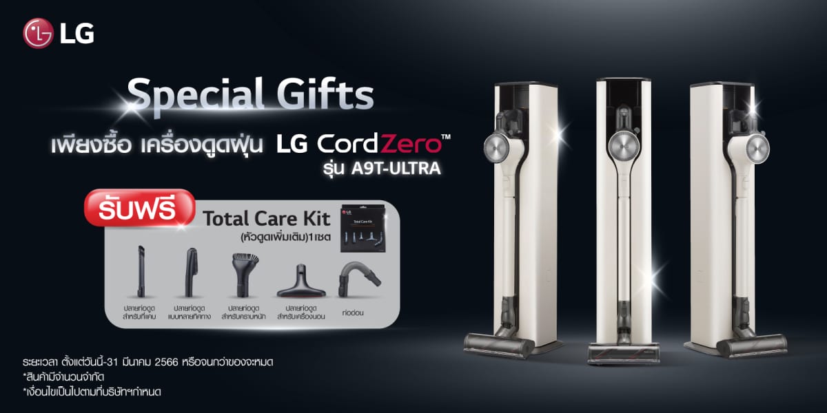 บริษัท แอลจี อีเลคทรอนิคส์ (ประเทศไทย) จำกัด ผู้นำระดับโลกด้านการพัฒนานวัตกรรมเครื่องใช้ไฟฟ้าภายในบ้าน ส่งนวัตกรรม เครื่องดูดฝุ่นไร้สาย LG CordZero รุ่น A9T-ULTRA โดดเด่นด้วยดีไซน์แบบ All-in-One Tower™ ที่ช่วยให้สะดวกต่อการจัดเก็บอุปกรณ์ทำความสะอาดภายในแท่นชาร์จ พร้อมระบบขจัดฝุ่นอัตโนมัติที่แก้ปัญหาฝุ่นละอองฟุ้งกระจายขณะทำความสะอาดถังเก็บฝุ่น ขับเคลื่อนด้วยเทคโนโลยี Dual PowerPack™ แบตเตอรี่สองก้อนที่สับเปลี่ยนกันใช้งานได้ ทำให้สามารถทำความสะอาดและชาร์จไฟได้พร้อมกัน และใช้งานอย่างต่อเนื่องได้ยาวนานสูงสุดถึง 120 นาที พร้อมเทคโนโลยี Kompressor™ ช่วยบีบอัดฝุ่นและเศษผมในถังเก็บฝุ่นได้มากขึ้นถึง 2.4 เท่าของปริมาณที่ไม่ผ่านการบีบอัด และประหยัดเวลาในการทำความสะอาด นอกจากนี้ เพื่อช่วยให้ผู้บริโภคชาวไทยใช้เวลาที่บ้านได้อย่างปลอดภัยในช่วงที่ปัญหาฝุ่นละอองในอากาศยังคงส่งผลกระทบต่อการใช้ชีวิตของผู้คนอย่างต่อเนื่อง เมื่อซื้อเครื่องดูดฝุ่นไร้สาย LG CordZero™ รุ่น A9T-ULTRA แถมฟรี! ชุดอุปกรณ์เสริมหัวดูดสำหรับการทำความสะอาด 5 หัว (Total Care Kit) ตั้งแต่วันนี้หรือจนกว่าสินค้าจะหมด ณ ห้างสรรพสินค้าชั้นนำหรือตัวแทนจำหน่ายของแอลจีทั่วประเทศ