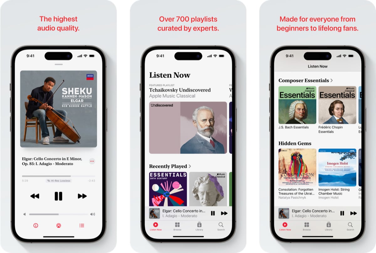 Apple Music Classical มอบประสบการณ์การฟังเพลงคลาสสิกชั้นเยี่ยมที่มาพร้อมกับเพลย์ลิสต์นับร้อยที่ได้รับการคัดสรรมาเป็นอย่างดี อัลบั้มเอ็กซ์คลูซีฟนับพัน ประวัตินักประพันธ์เพลงที่ลงลึกอย่างละเอียด บทความแนะนำสำหรับชิ้นงานสำคัญ ฟีเจอร์การค้นหาที่ใช้งานง่าย และอื่นๆ อีกมากมาย