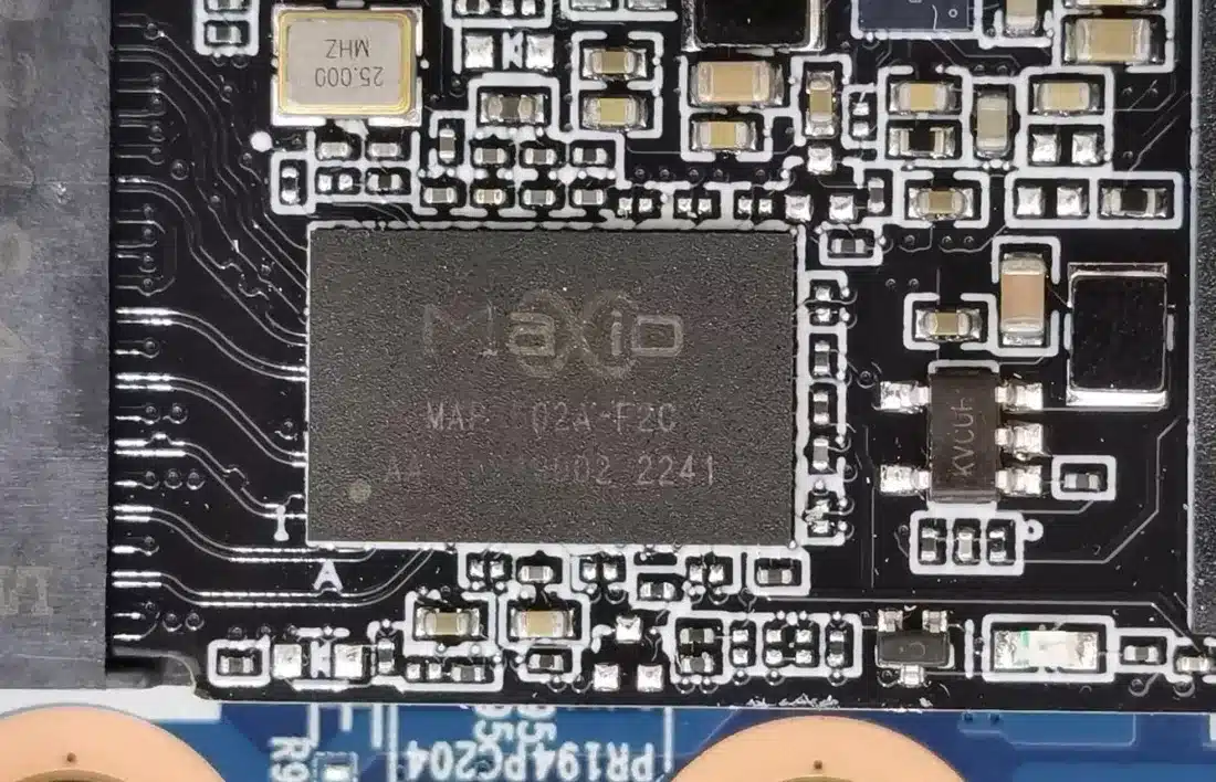 ตัวชิปควบคุม Controller เขียนไว้เป็น Maxio MAP1602A เป็นชิปควบคุม SSD PCIe 4.0 ส่วนชิปความจำ NAND เป็น YMTC TLC 3D NAND (X2-9060) 128 เลเยอร์ แทนที่จะเป็นชิปของ Samsung เองทั้งหมด