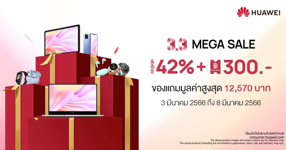 HUAWEI ส่งโปรเอาใจขาชอป 3.3 MEGA SALE มอบส่วนลดสูงสุด 42% พร้อมของแถมมูลค่าสูงสุด 12,570 บาท ตั้งแต่วันที่ 3 มีนาคม 2566 ถึง 8 มีนาคม 2566
