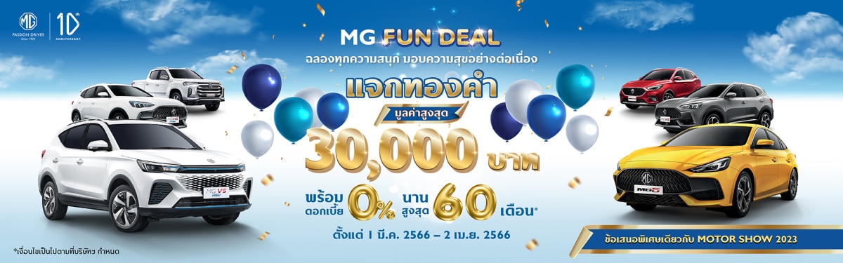 เอ็มจี มอบความสุขสุดคุ้มแบบไม่ต้องลุ้นให้ลูกค้ากับแคมเปญ MG FUN DEAL ดอกเบี้ย 0% นานสูงสุด 60 เดือน รับทองมูลค่าสูงสุด 30,000 บาท ตั้งแต่วันที่ 1 มีนาคม 2566 ถึงวันที่ 2 เมษายน 2566