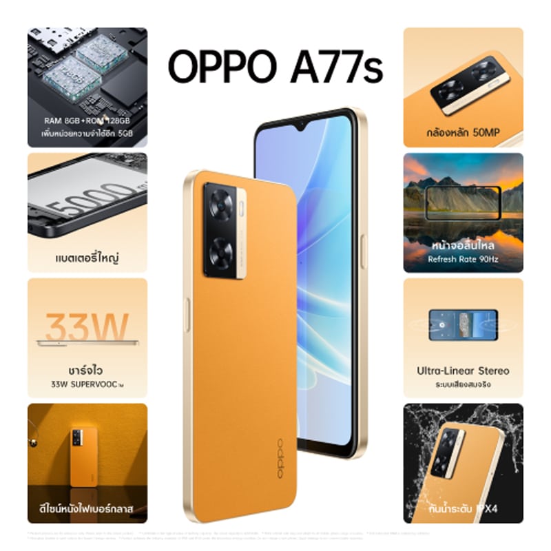 โดย OPPO A77s มาพร้อม RAM 8GB เพิ่มหน่วยความจำได้อีก 8GB พร้อม ROM 128GB ใช้งานได้รวดเร็ว เก็บข้อมูลได้ครบ สนุกได้ทุกเอ็นเทอร์เทนเมนต์ ใช้งานได้ยาวนานตลอดวันด้วยแบตเตอรี่ 5,000mAh เสริมด้วยชาร์จไว 33W SUPERVOOC มาพร้อมหน้าจอขนาดใหญ่ 6.56 นิ้ว ให้สีสันเต็มอิ่ม พร้อมถนอมสายตา เต็มอิ่มได้ทุกความบันเทิง ถ่ายภาพสนุกทุกโมเมนต์ด้วยกล้องหลัก 50MP มอบภาพถ่ายบุคคลที่งดงาม พร้อมฟีเจอร์ Bokeh Flare Portrait มอบพื้นหลังละลายด้วยดวงไฟโบเก้ พร้อมถ่ายภาพคนสวยเป็นธรรมชาติ