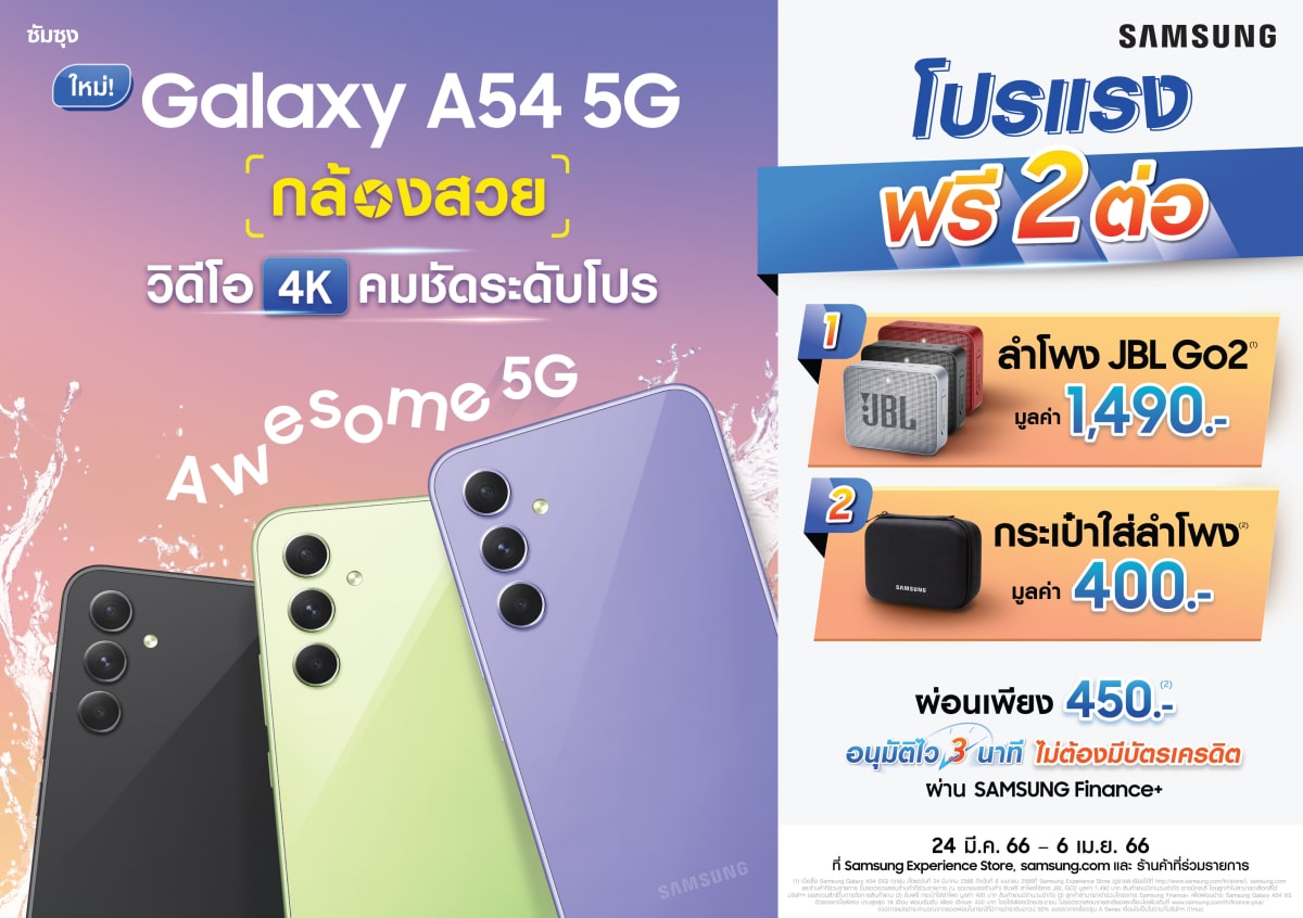โดยในวันนี้ Samsung Galaxy A54 5G ได้วางจำหน่ายอย่างเป็นทางการทั่วประเทศแล้วพร้อมโปรโมชันสุดคุ้มตั้งแต่วันที่ 24 มีนาคม 2566 – 6 เมษายน โปรแรงฟรี 2 ต่อ ลำโพง JBL Go2 พร้อมกระเป๋า มูลค่า 1,890 บาท อย่ารอช้า รีบพุ่งตัวไปจับจองด่วนที่ samsung.com, Samsung Experience Store และร้านค้าที่ร่วมรายการ