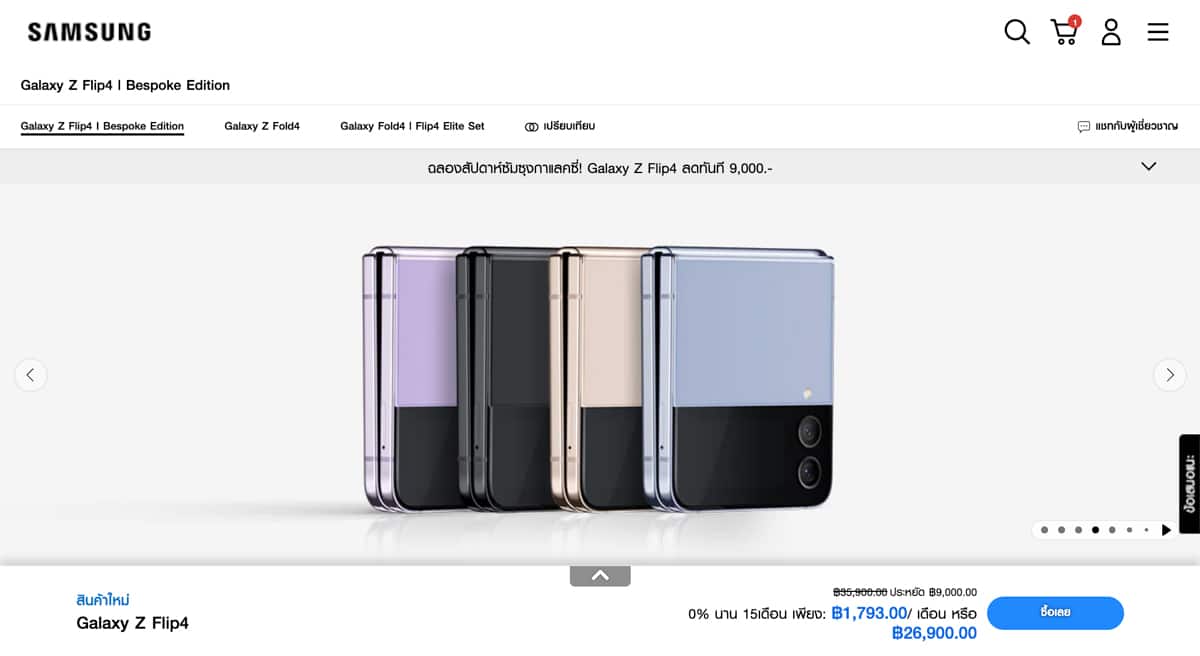 - Galaxy Z Flip4 128GB | 8GB ราคาปกติ 35,900 บาท ลดราคา เหลือ 26,900 บาท
