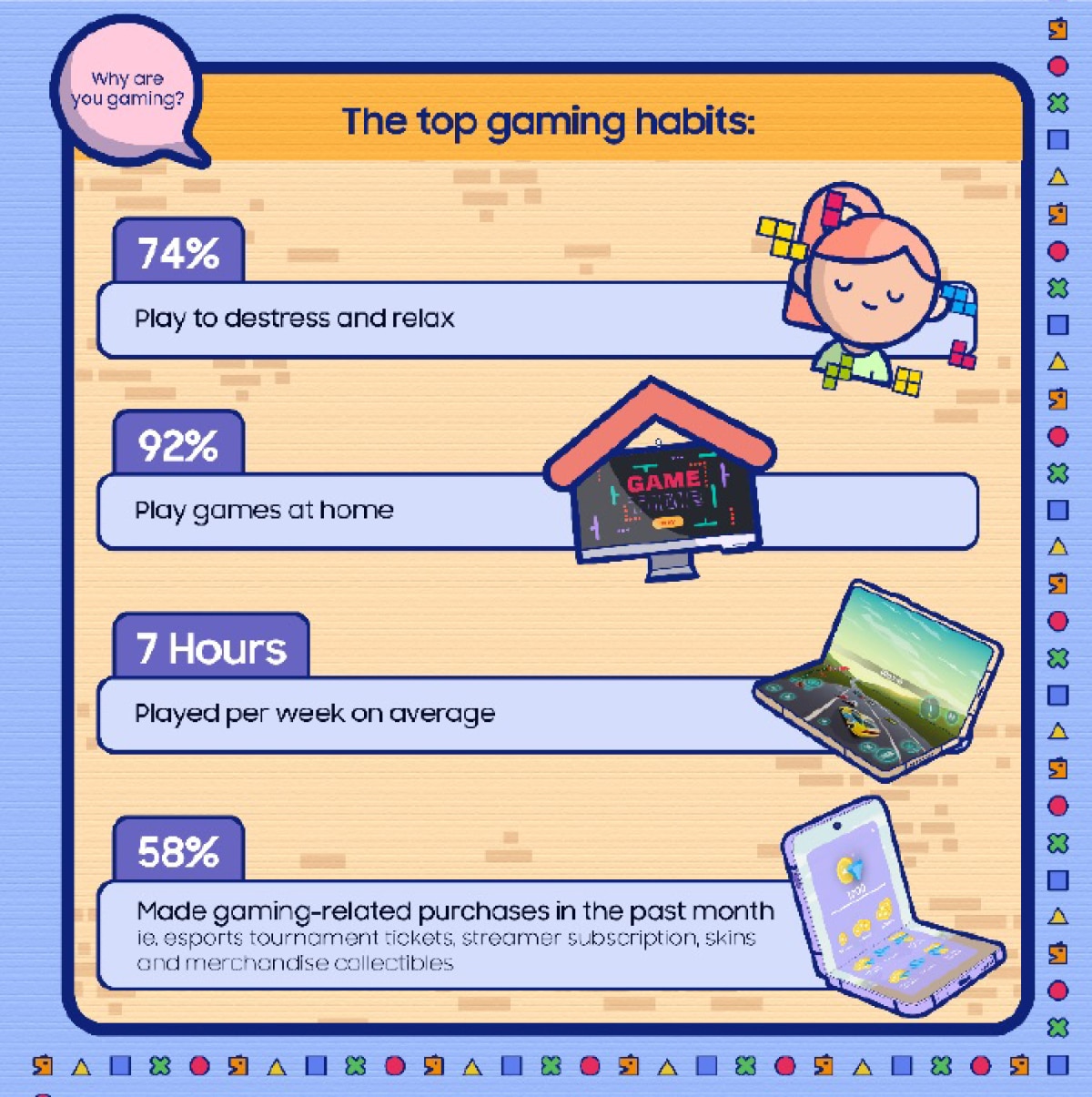 การเล่นเพื่อลดความเครียดและผ่อนคลายถือว่าเป็นเหตุผลหลักในการเล่นเกมถึง 74% โดยใช้เวลาเล่นเกมเฉลี่ย 7 ชั่วโมงต่อสัปดาห์ ผู้เล่นเกมส่วนใหญ่ (92%) ชอบเล่นเกมที่บ้านและผู้บริโภคมากกว่าครึ่ง (58%) ใช้จ่ายเฉลี่ย 30 ดอลลาร์สหรัฐฯ ต่อเดือนในการซื้อสิ่งที่เกี่ยวข้องกับการเล่นเกม เช่น เนื้อหาพิเศษออนไลน์ บัตรเข้าชมการแข่งขันอีสปอร์ต สมัครสมาชิกของสตรีมเมอร์ ซื้อสกิน และซื้อของสะสม