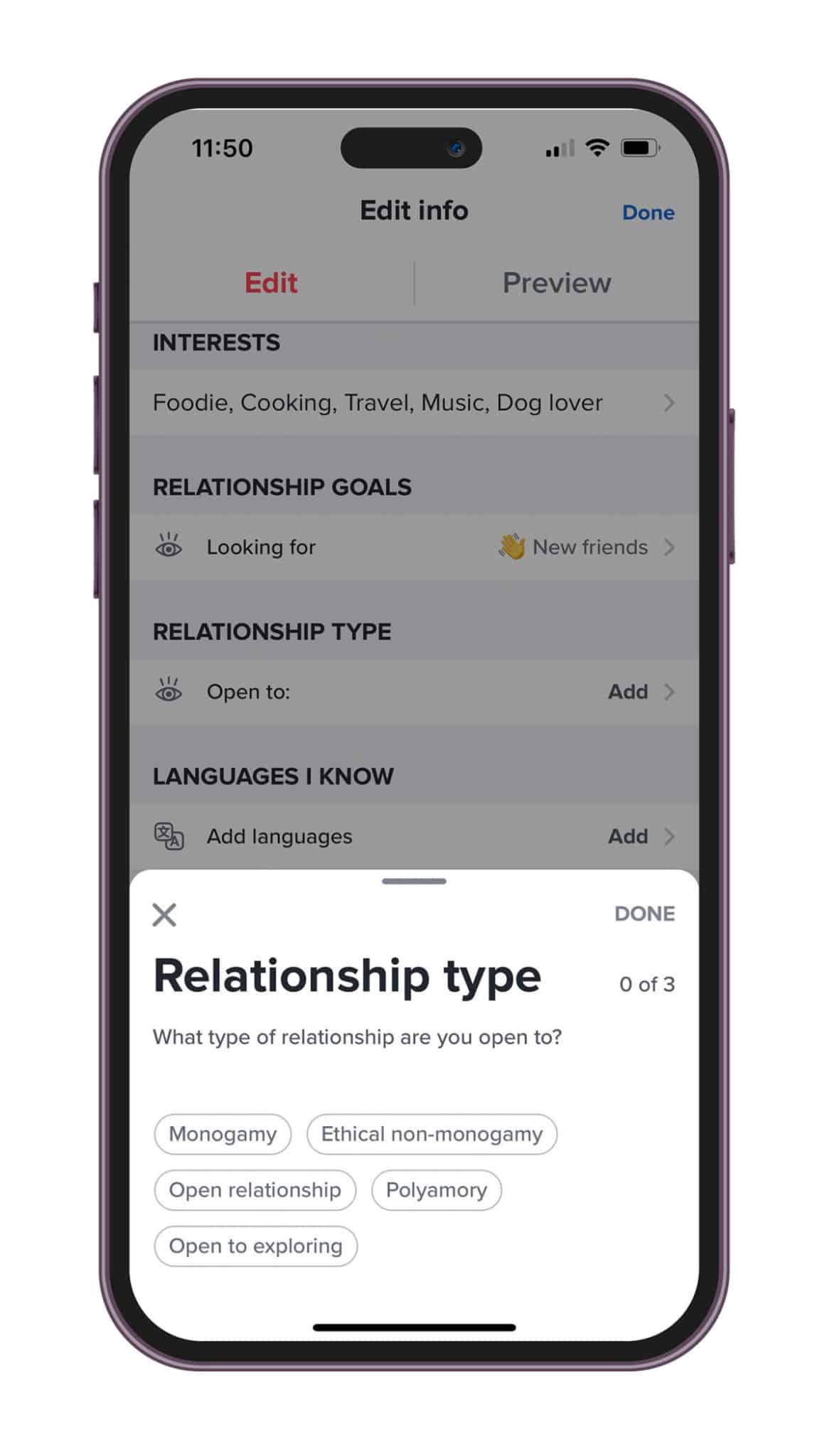 ผลสำรวจของ Tinder พบว่า 73% ของคนนิวเจน กำลังมองหาใครสักคนที่มีความชัดเจนในสิ่งที่ตัวเองต้องการ2 นั่นหมายถึง การใส่ข้อมูลส่วนตัวลงไปบนหน้าโปรไฟล์ Tinder แสดงให้เห็นถึงความมุ่งมั่น ความจริงใจ และความซื่อสัตย์ได้ ทั้งนี้สมาชิก Tinder ในไทยสามารถเลือกรูปแบบความสัมพันธ์ที่ต้องการได้แล้ว ดังนี้