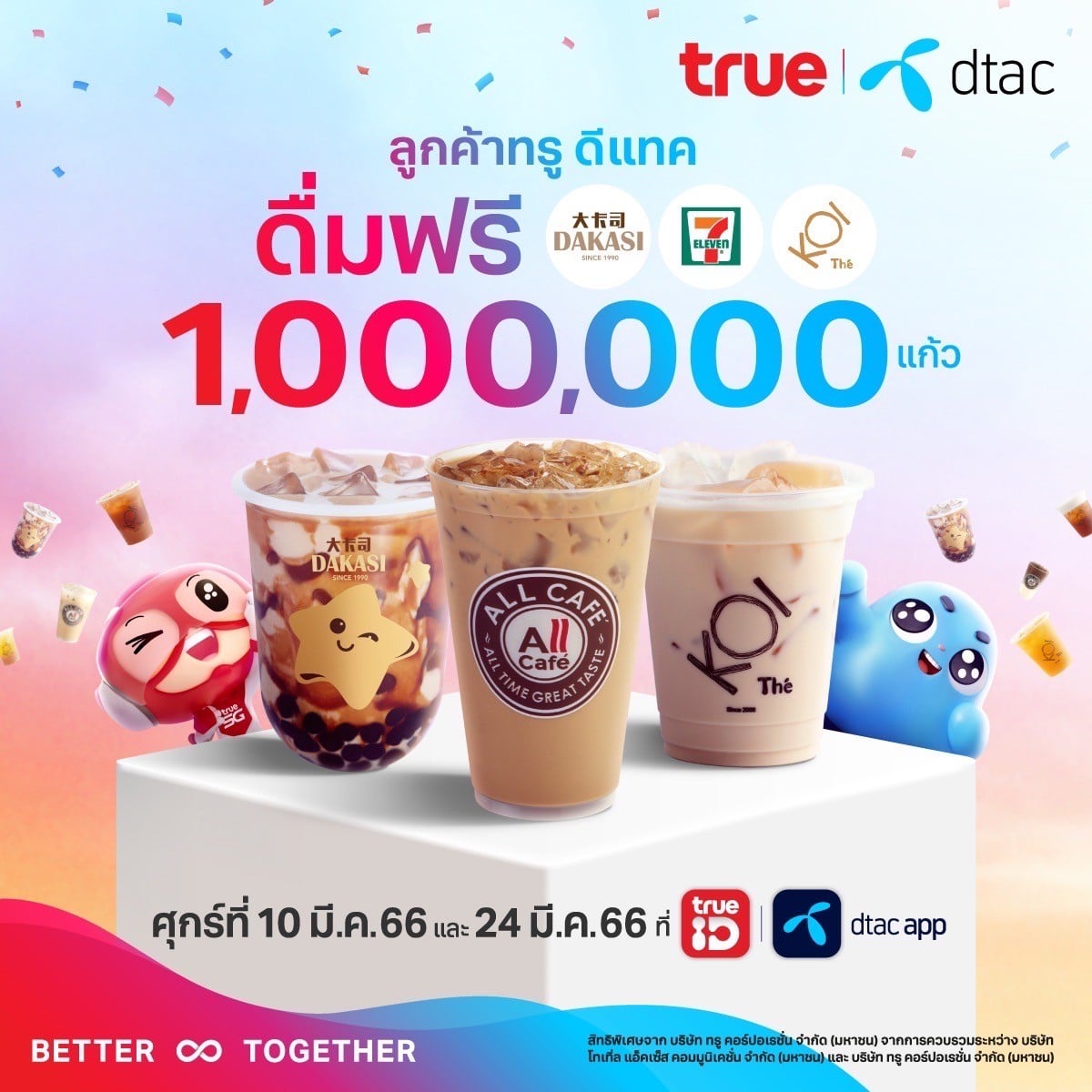 ลูกค้า True และ dtac สุขยิ่งกว่าเมื่อมีกันและกัน เลือกรับ เครื่องดื่มฟรี รวม 1,000,000 แก้ว จาก 3 แบรนด์ดัง All Cafe’, KOI The’ และ DAKASI ใครพลาดครั้งนี้ เตรียมดื่มฟรีอีกที ศุกร์ 24 มี.ค. 66