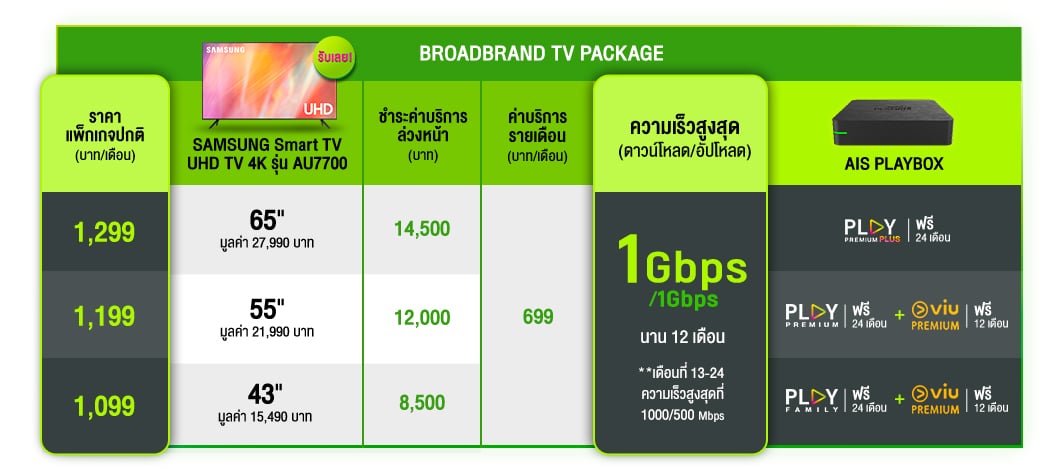 มาแล้ว! รายละเอียด โปรโมชัน เน็ตบ้าน AIS Fibre สมัครแพ็กเกจ BROADBAND TV 1,299 บาทต่อเดือน ได้เน็ตความเร็วสูงสุด 1Gbps/1Gbps นาน 12 เดือน พิเศษ รับฟรีไปเลย ทีวี Samsung Smart TV 4K รุ่น AU7700 ให้คุณเปิดประสบการณ์คอนเทนต์บันเทิงความคมชัดระดับ 4K UHD รับชมคอนเทนต์ดังระดับโลกแบบจัดเต็ม ผ่านกล่อง AIS PLAYBOX