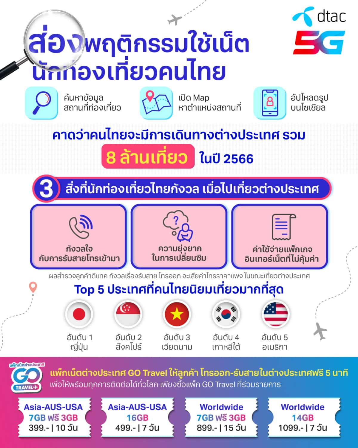ข้อมูลจากลูกค้าดีแทค ที่สมัครแพ็กเกจ GO Travel ไปใช้อินเทอร์เน็ตเที่ยวในต่างประเทศระบุ 5 ประเทศที่คนไทยนิยมไปเที่ยวมากที่สุดคือ